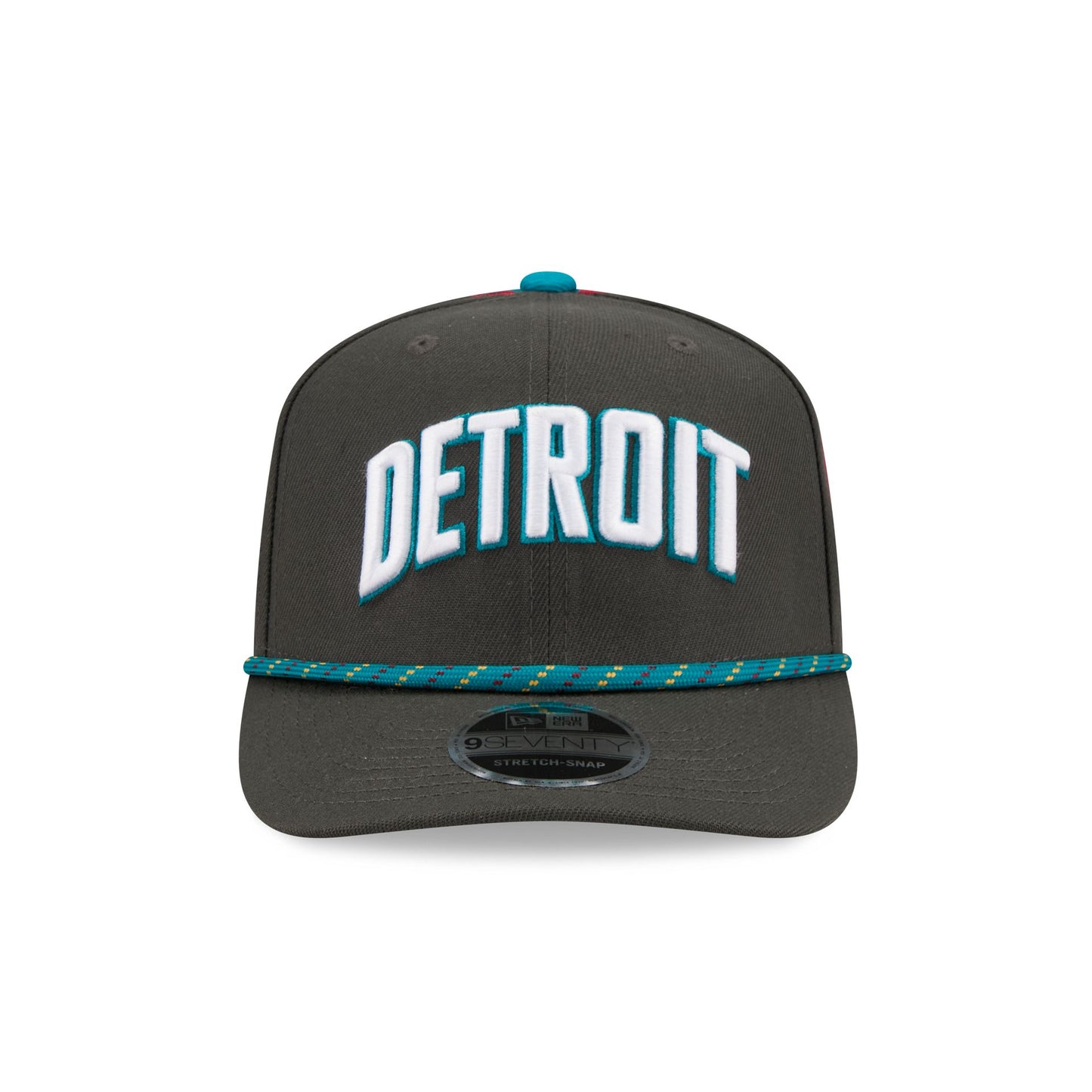 The Detroit Pistons 2025 City Edition 9SEVENTY Stretch-Snap features an embroidered Pistons City Edition logo at the front panels with a logo at the right-wear side and a rope at the visor. Additional details include the NBA Logoman above an adjustable stretch-snap closure at the rear and a gray undervisor.