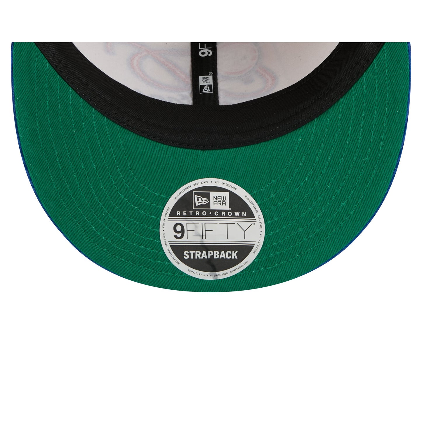 The Detroit Pistons Pinstripe Script Retro Crown 9FIFTY Adjustable Cap features an embroidered Pistons logo and cursive wordmark at the front panels wit an adjustable belt closure at the rear and a green undervisor.