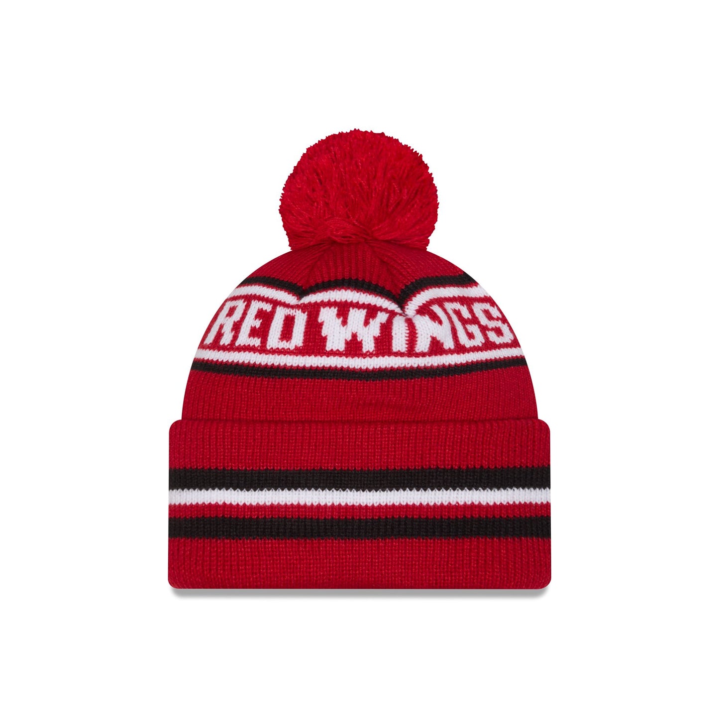 The Detroit Red Wings Classic Pom Knit Hat features an embroidered Red Wings logo at the front cuff with a wordmark at the crown and a one-time removable pom.