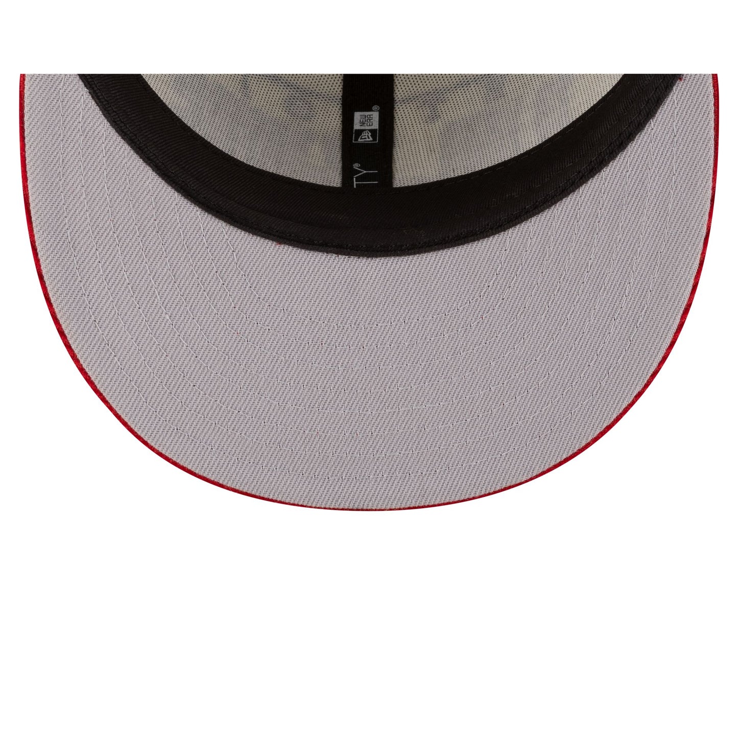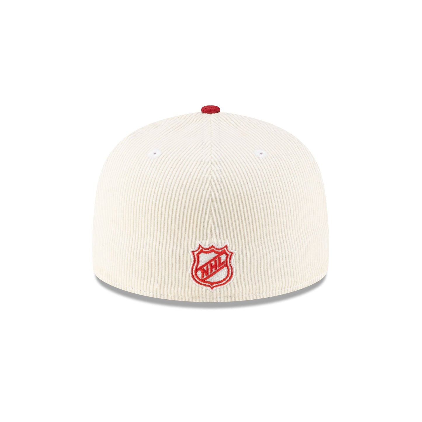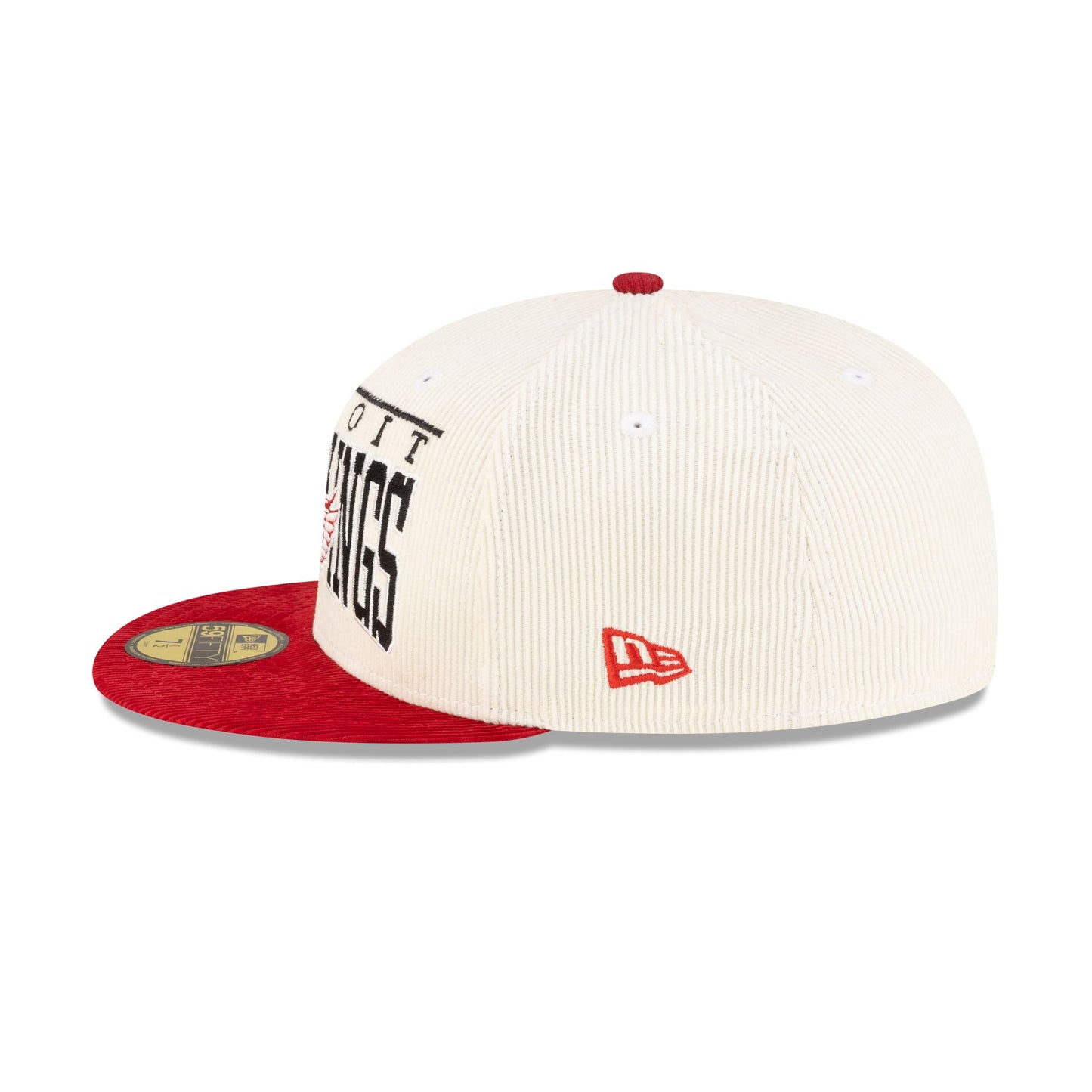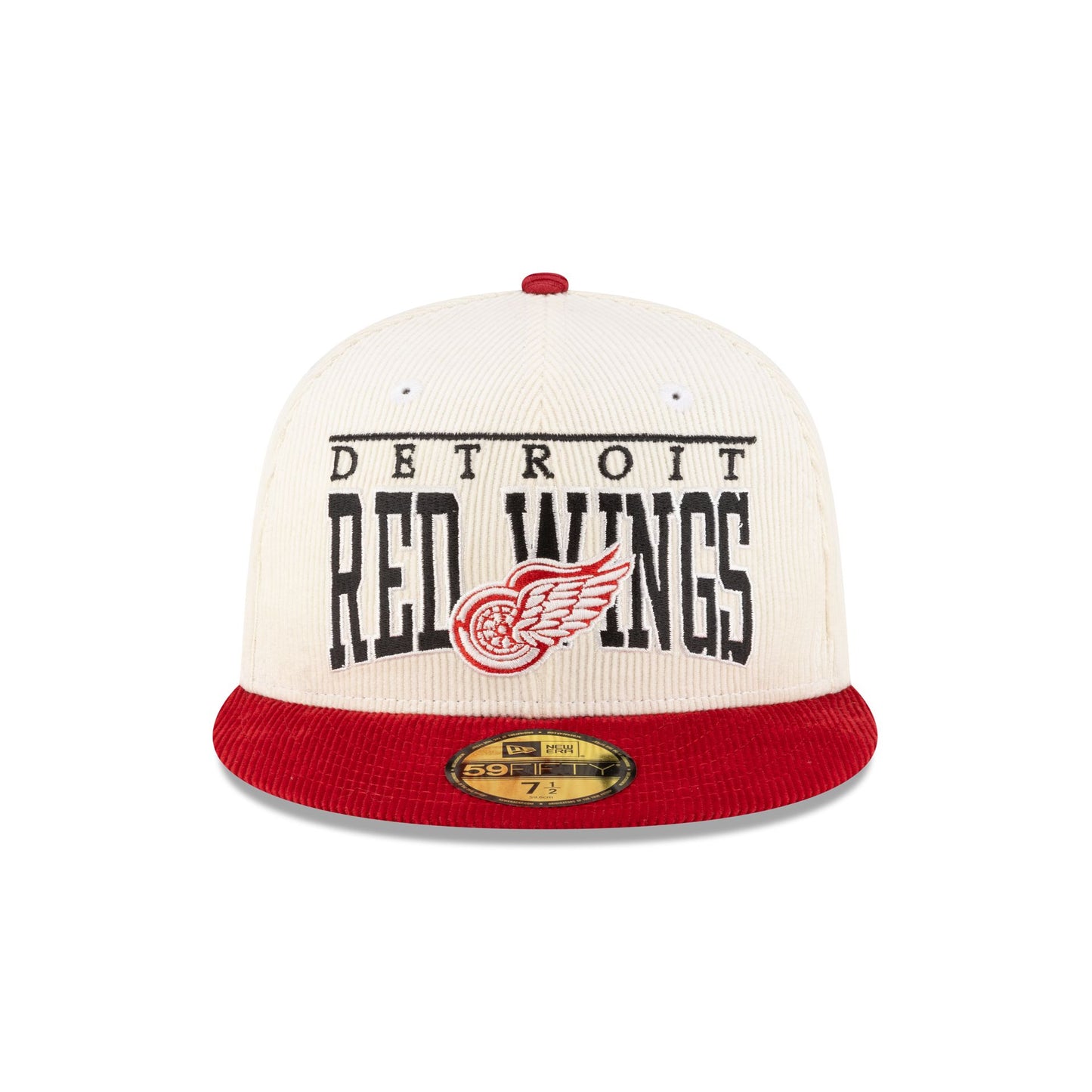 The Detroit Red Wings Corduroy Chrome 59FIFTY Fitted Cap features an embroidered Red Wings wordmark and logo at the front panels with a matching NHL Shield at the rear, a 100th Anniversary patch at the right-wear side, and a gray undervisor.