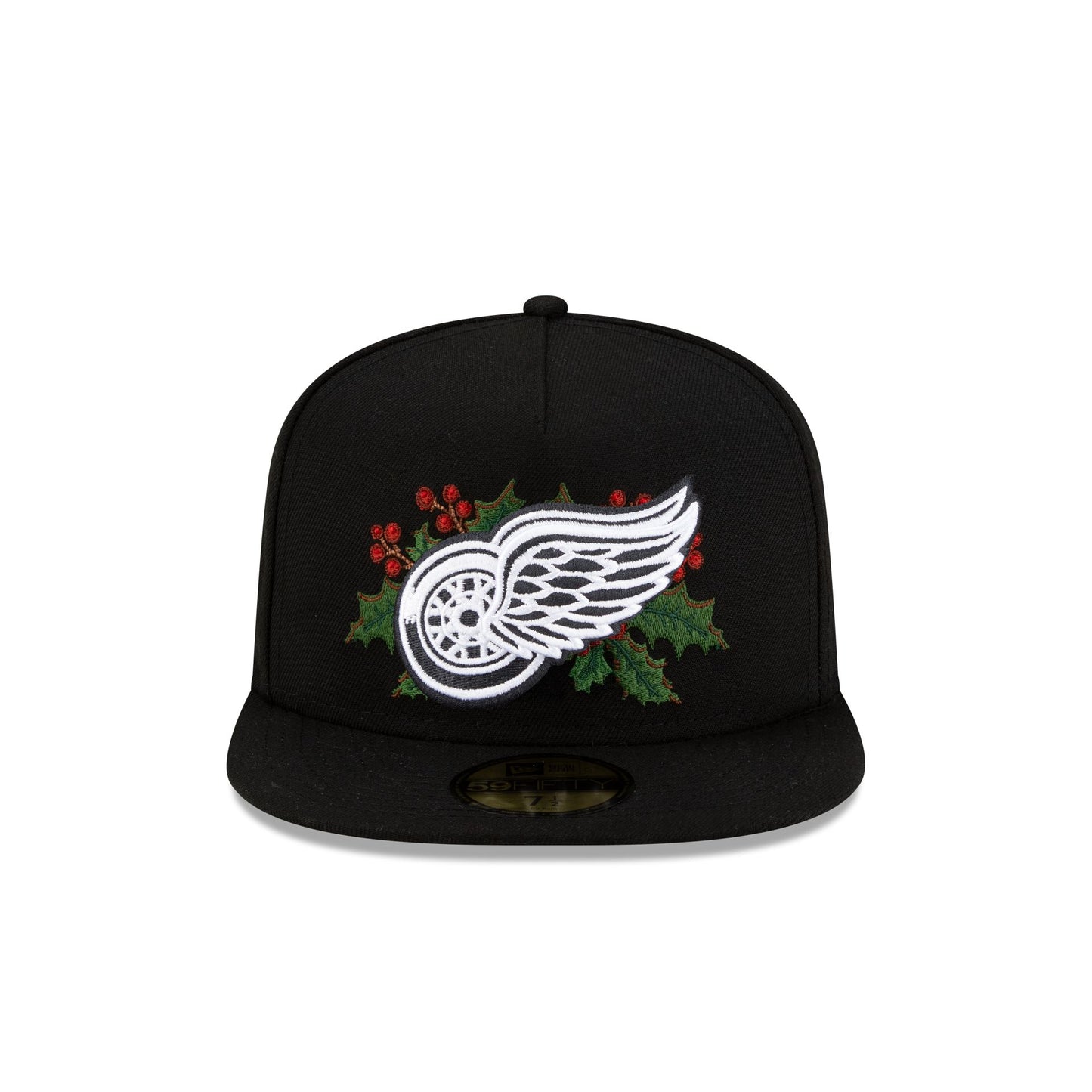 The Detroit Red Wings Holly 59FIFTY A-Frame Fitted Cap features an embroidered Red Wings black and white logo with holly at the front panels with a matching NHL Shield logo at the rear. Additional details include a holly New Era Flag at the left-wear side and a black undervisor.