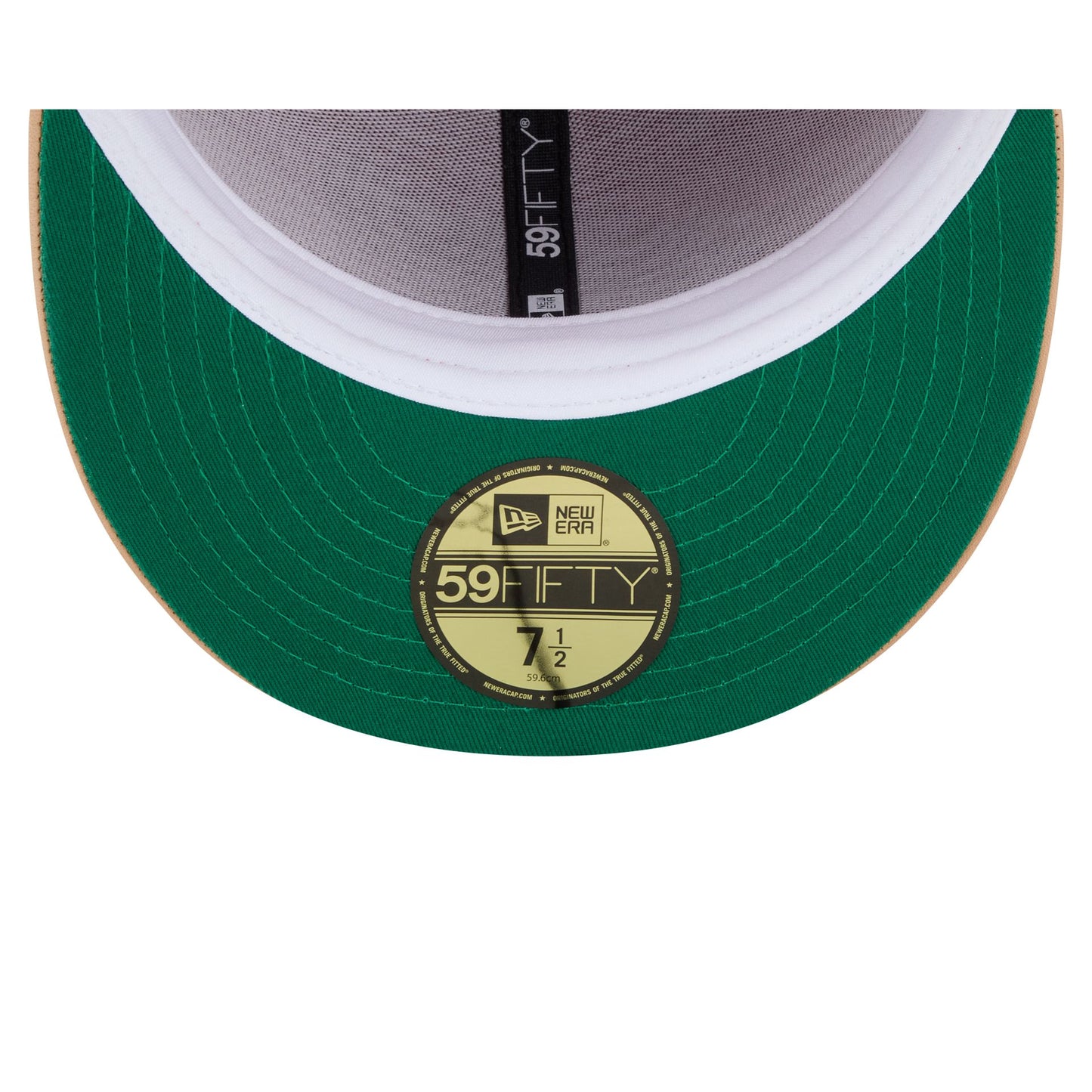 The Detroit Red Wings Leather Visor 59FIFTY Fitted Cap features an embroidered Red Wings logo at the front panels with a cream leather visor. Additional details include an NHL Shield logo at the rear and a green undervisor with leather accents throughout.