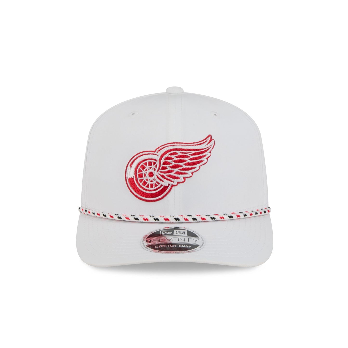 The Detroit Red Wings Optic White Performance Rope 9SEVENTY Stretch-Snap features an embroidered Red Wings logo at the front panels with a performance fabric throughout. Additional details include a rope at the visor, an adjustable stretch-snap closure at a performance mesh rear, and a team color undervisor.