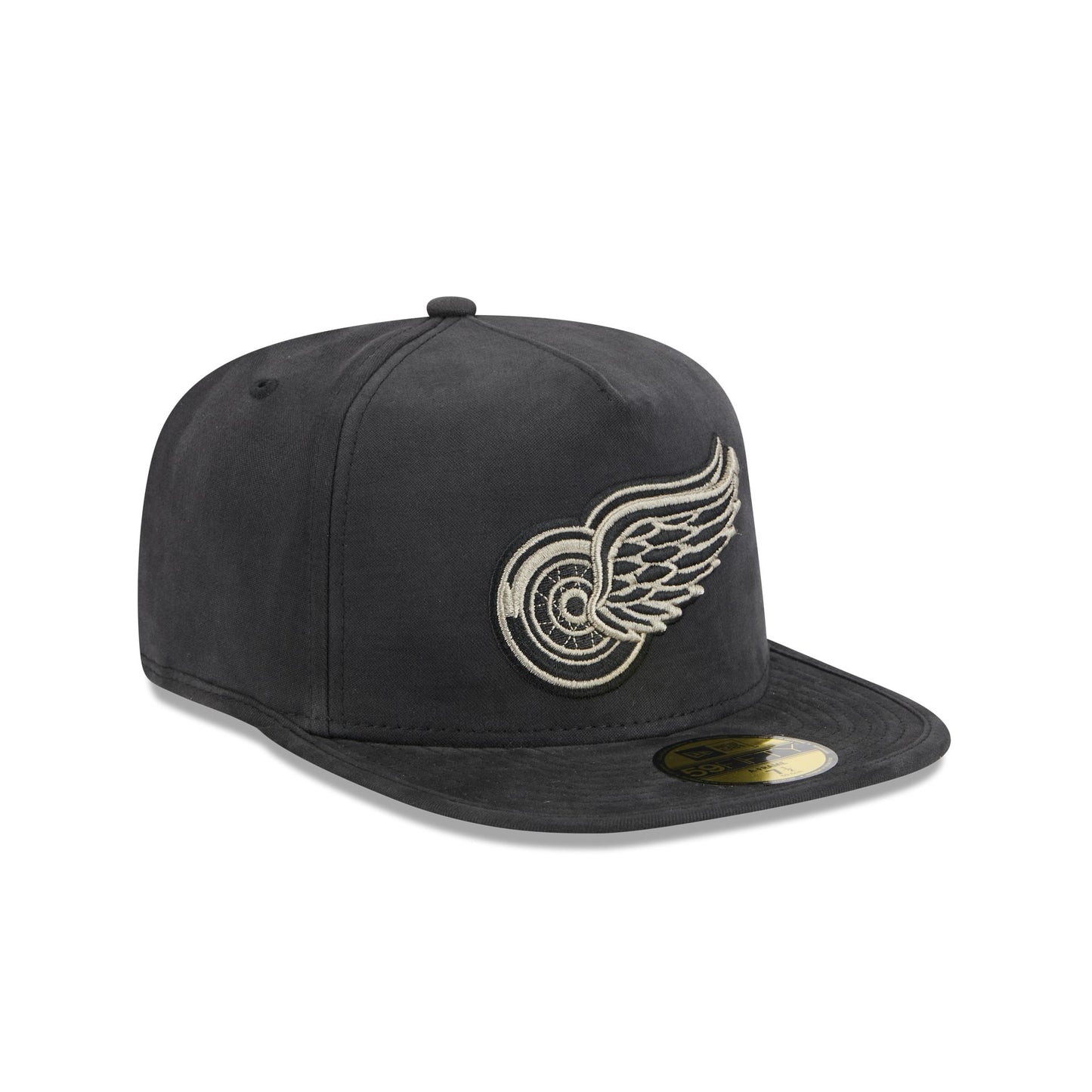 The Detroit Red Wings Quilted 59FIFTY A-Frame Fitted Cap features an embroidered Red Wings logo at the front panel with a matching NHL Shield at the rear, a brushed cotton fabrication, and a green undervisor.
