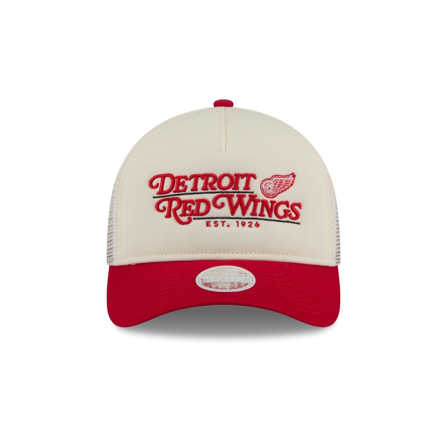 The Detroit Red Wings Retro Chrome Women's White 9FORTY M-Crown A-Frame Trucker features an embroidered Red Wings graphic against a plush front panel with an adjustable snapback closure at a mesh rear and a team color undervisor.