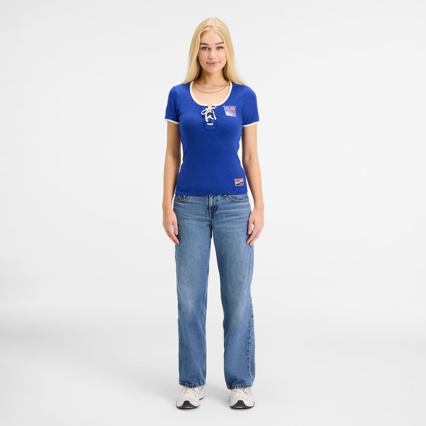 The Detroit Red Wings Throwback Tie Women's T-Shirt features a screen-printed Red Wings logo at the left chest with a New Era jock tag at the left hip. Additional details include a lace tie at a V-neck.