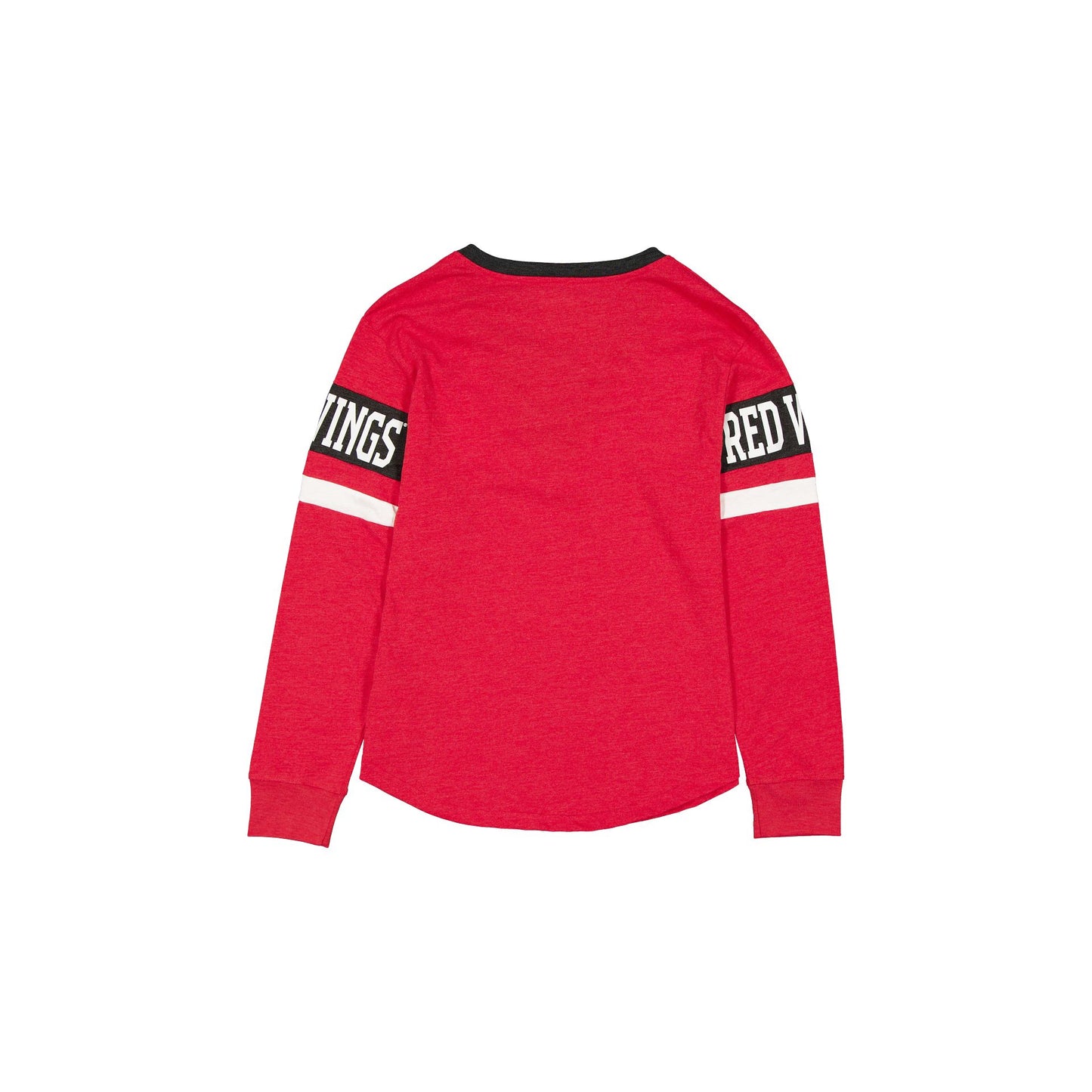 The Detroit Red Wings Throwback Women's V-Neck Long-Sleeve T-Shirt features an embroidered Red Wings logo at the left chest with ties at a v-neckline with varsity stripes and wordmarks at each arm.