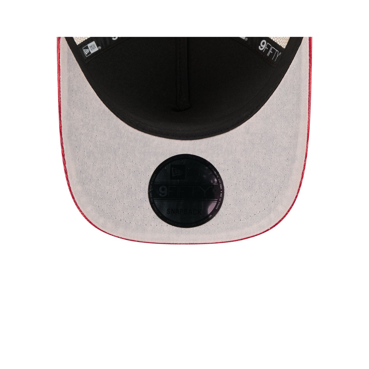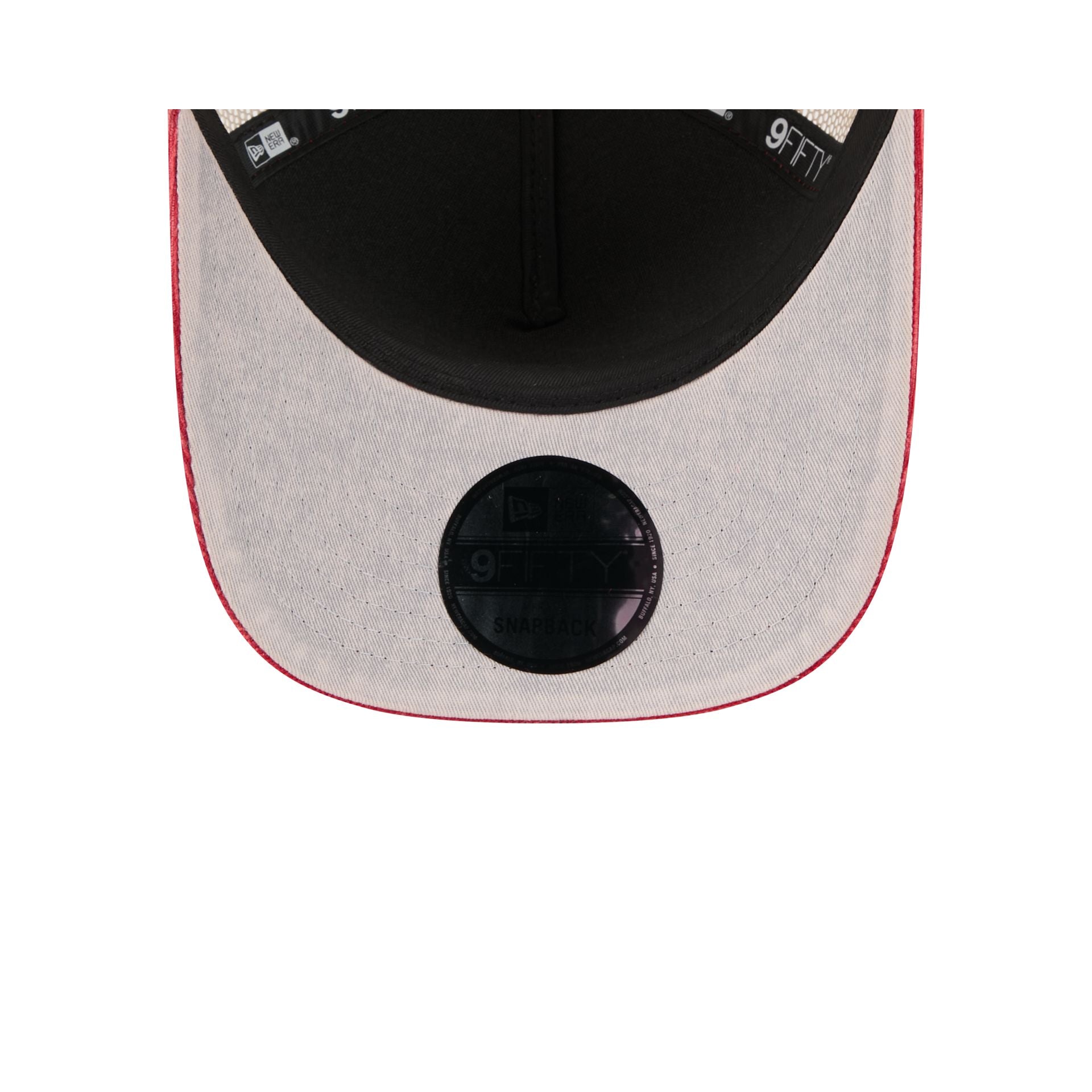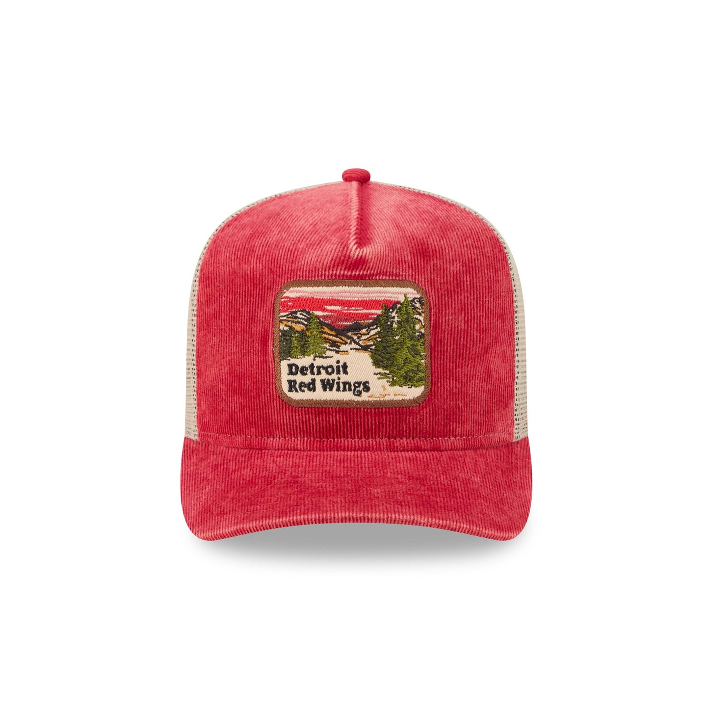 The Detroit Red Wings Vintage Landscape 9FIFTY A-Frame Trucker features an embroidered Red Wings Vintage Landscape patch at the front panels with a team logo at the right-wear side. Additional details include an adjustable snapback closure at the rear and a gray undervisor.