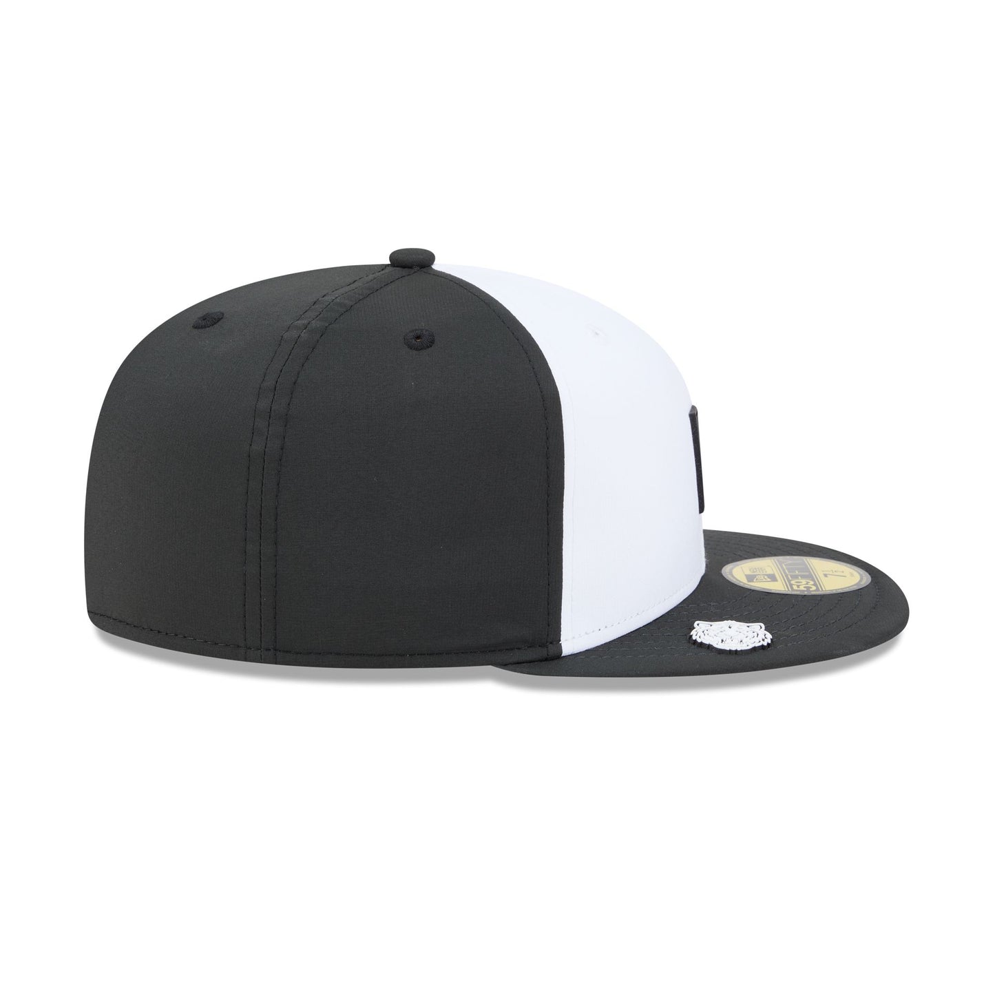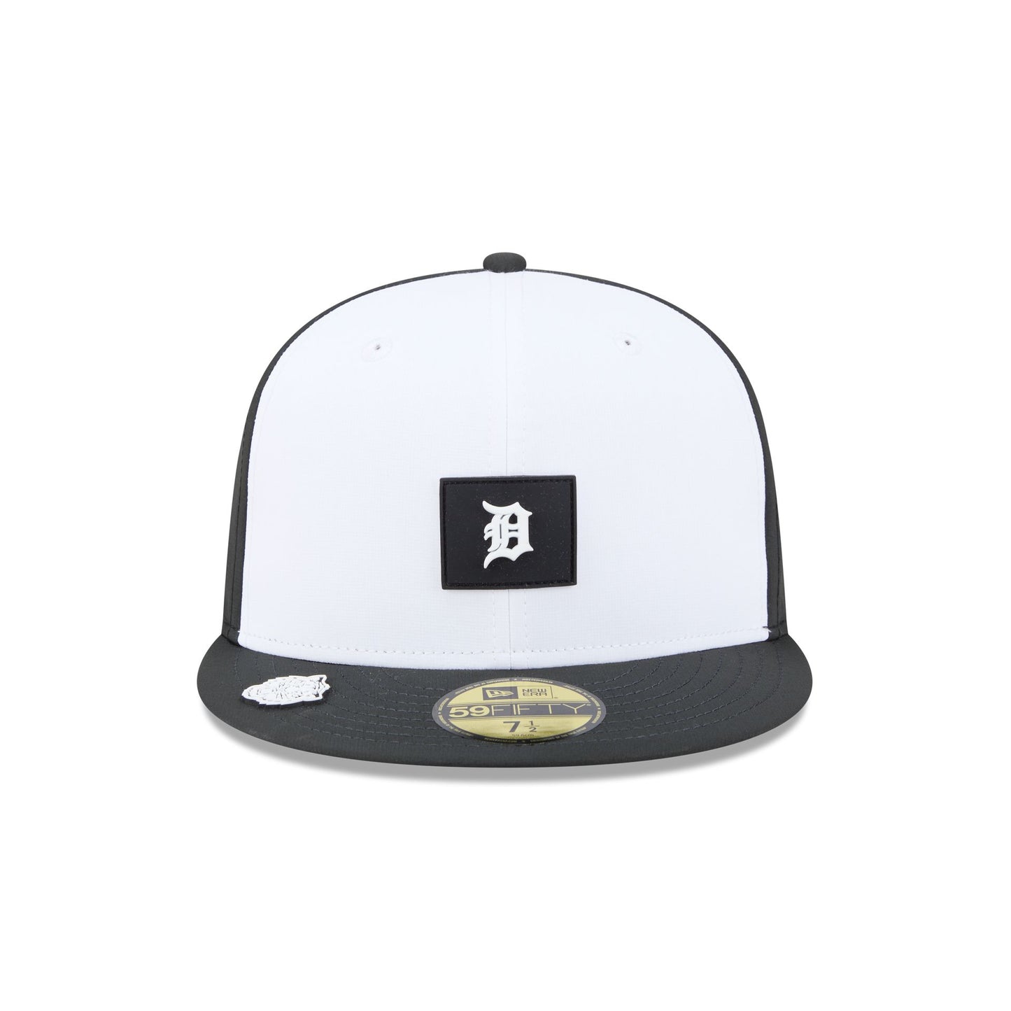 The Detroit Tigers 2026 Clubhouse Black & White 59FIFTY Fitted Cap features a sewn-down silicone Tigers logo patch at the front panels with a water-repellent quill tech fabrication throughout. Additional details include a silicone MLB Batterman logo patch at the rear and a gray undervisor. The visor is accented with a silicone transfer team patch.