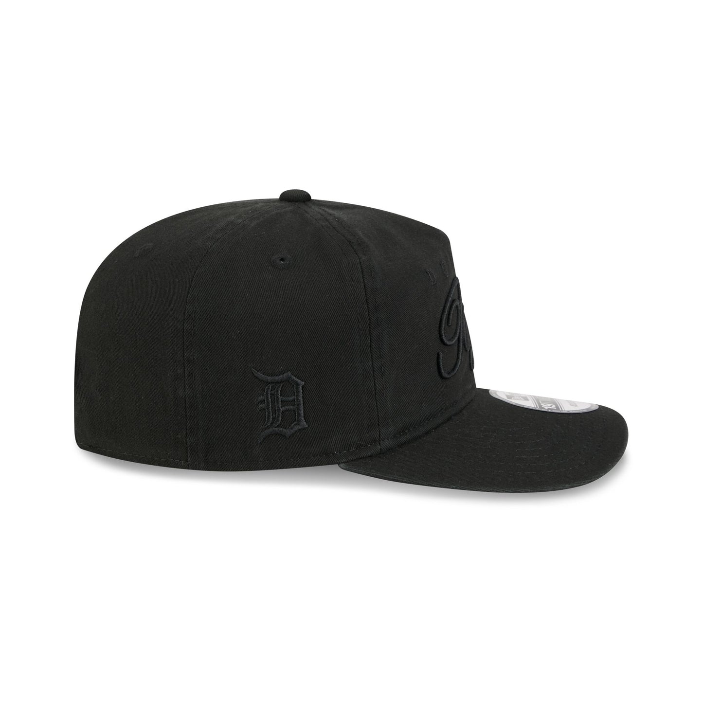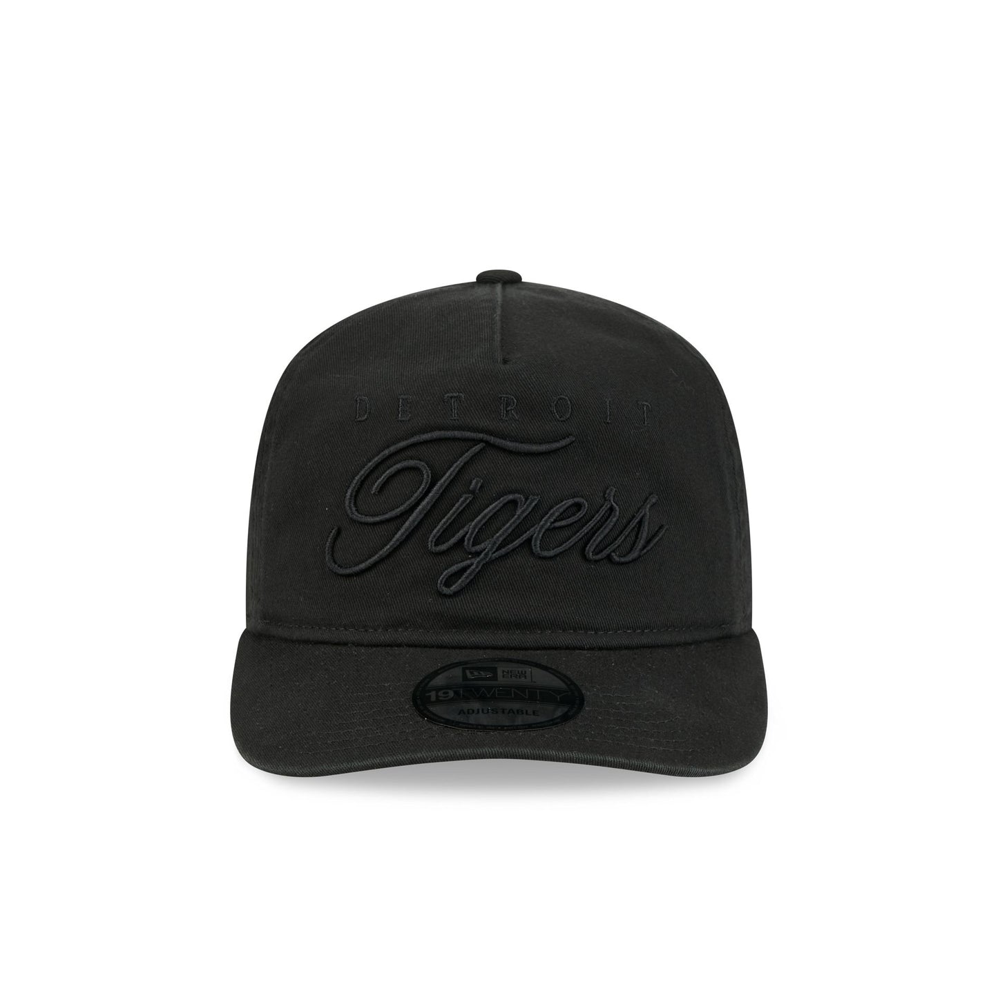 The Detroit Tigers All Black Scripted 19TWENTY Adjustable Cap features an embroidered Tigers all black script wordmark at the front panels with a matching team logo at the right-wear side. Additional details include an adjustable snapback closure at the rear and a gray undervisor.