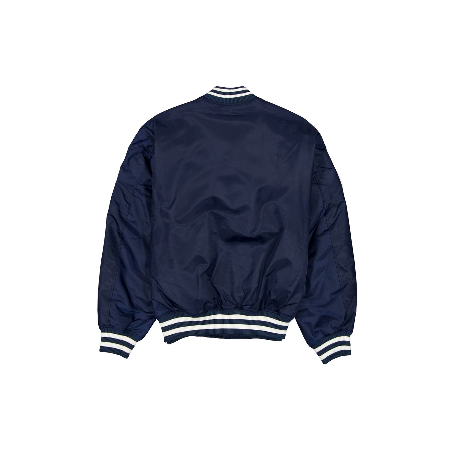The Detroit Tigers Authentic Navy Stadium Jacket features a stitched down applique Tigers logo at the left chest with an alternate team logo patch at the left sleeve, a snap-button closure at the front, and snap-button side pockets. Additional details include an American Flag patch at the right sleeve with striped details at the banding on the sleeves and hem, an interior pocket at the left chest, and a quilted 3M insolation lining.