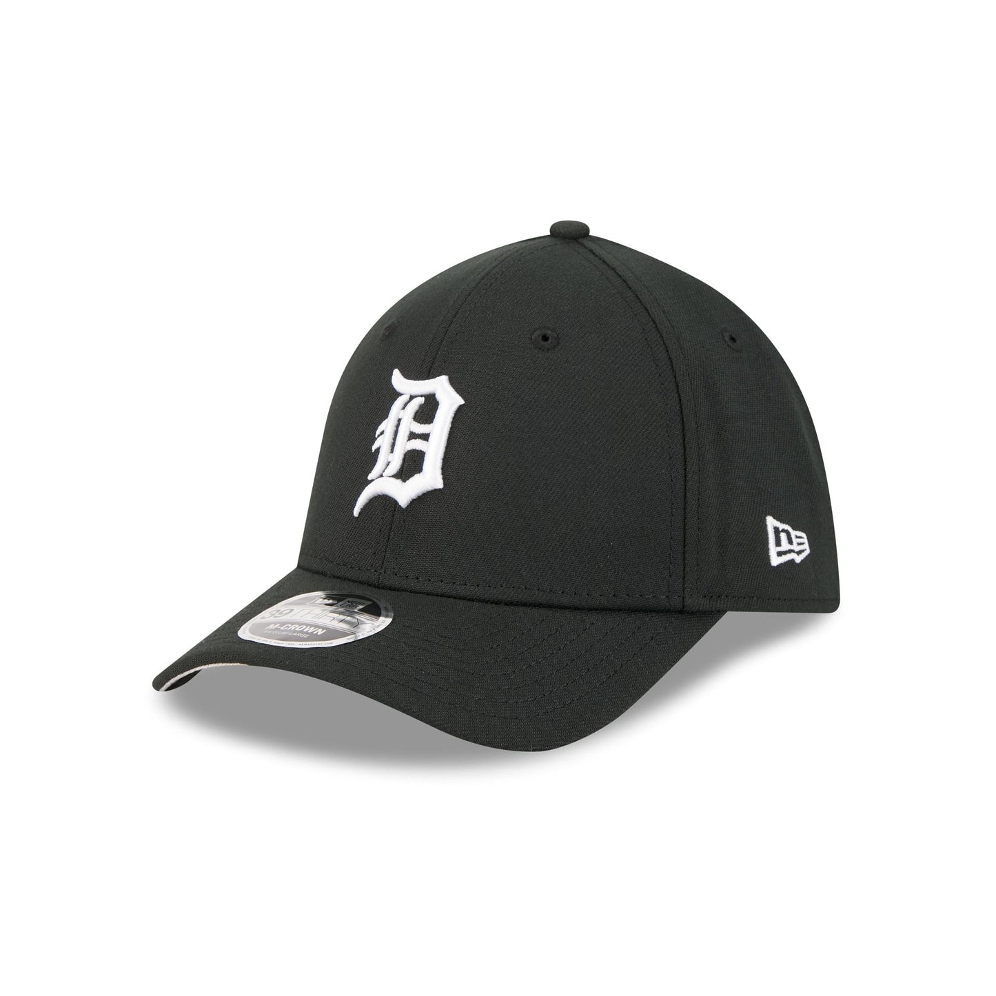 The Detroit Tigers Black and White 39THIRTY M-Crown Stretch Fit Cap features an embroidered Tigers logo at the front panels with a matching team wordmark at the rear and a gray undervisor. Additional details include a Performance Stretch sweatband and a New Era Flag at the left-wear side.