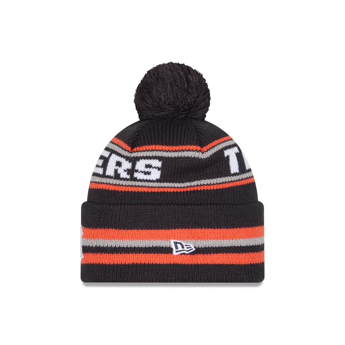 The Detroit Tigers Classic Pom Knit Hat features an embroidered Tigers logo at the front cuff with a wordmark at the crown and a one-time removable pom.