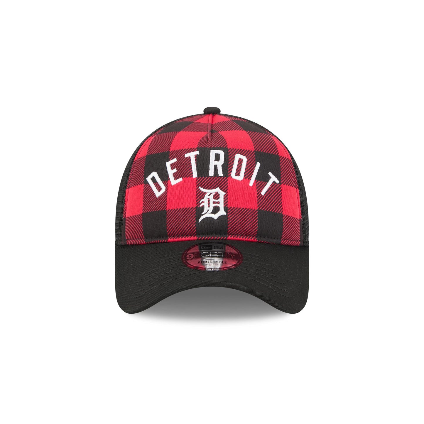 The Detroit Tigers Evergreen Check 9FORTY A-Frame Trucker features an embroidered Tigers white wordmark and logo at a checkered plaid front panel. Additional details include an adjustable snapback closure at a mesh rear.