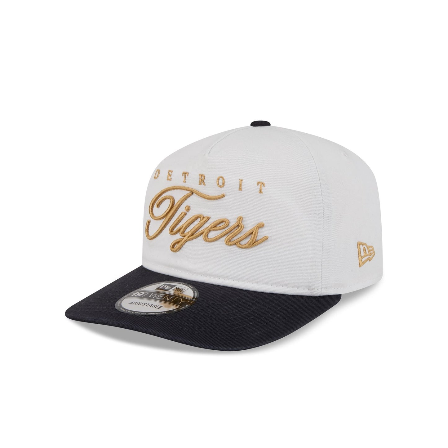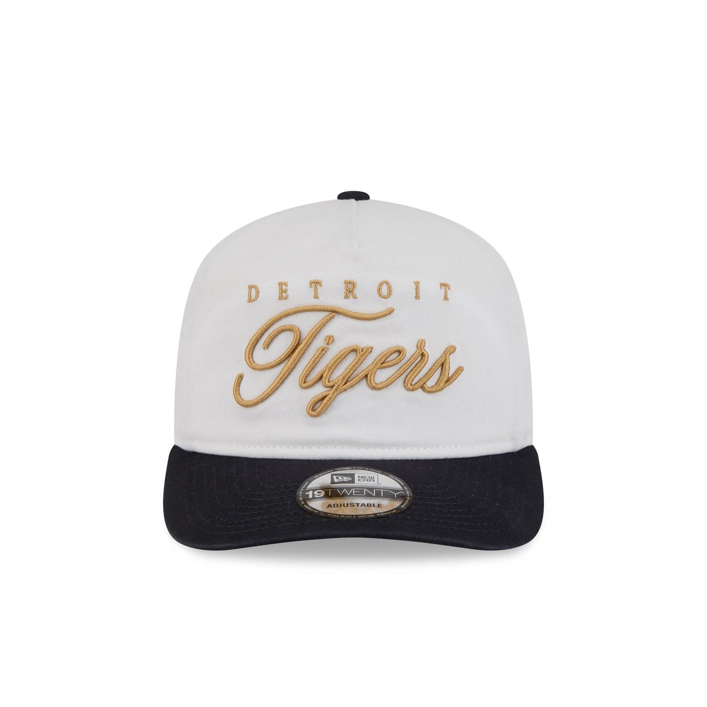 The Detroit Tigers Gold Scripted 19TWENTY Adjustable Cap features an embroidered Tigers gold script wordmark at the front panels with a matching team logo at the right-wear side. Additional details include an adjustable snapback closure at the rear and a gray undervisor.