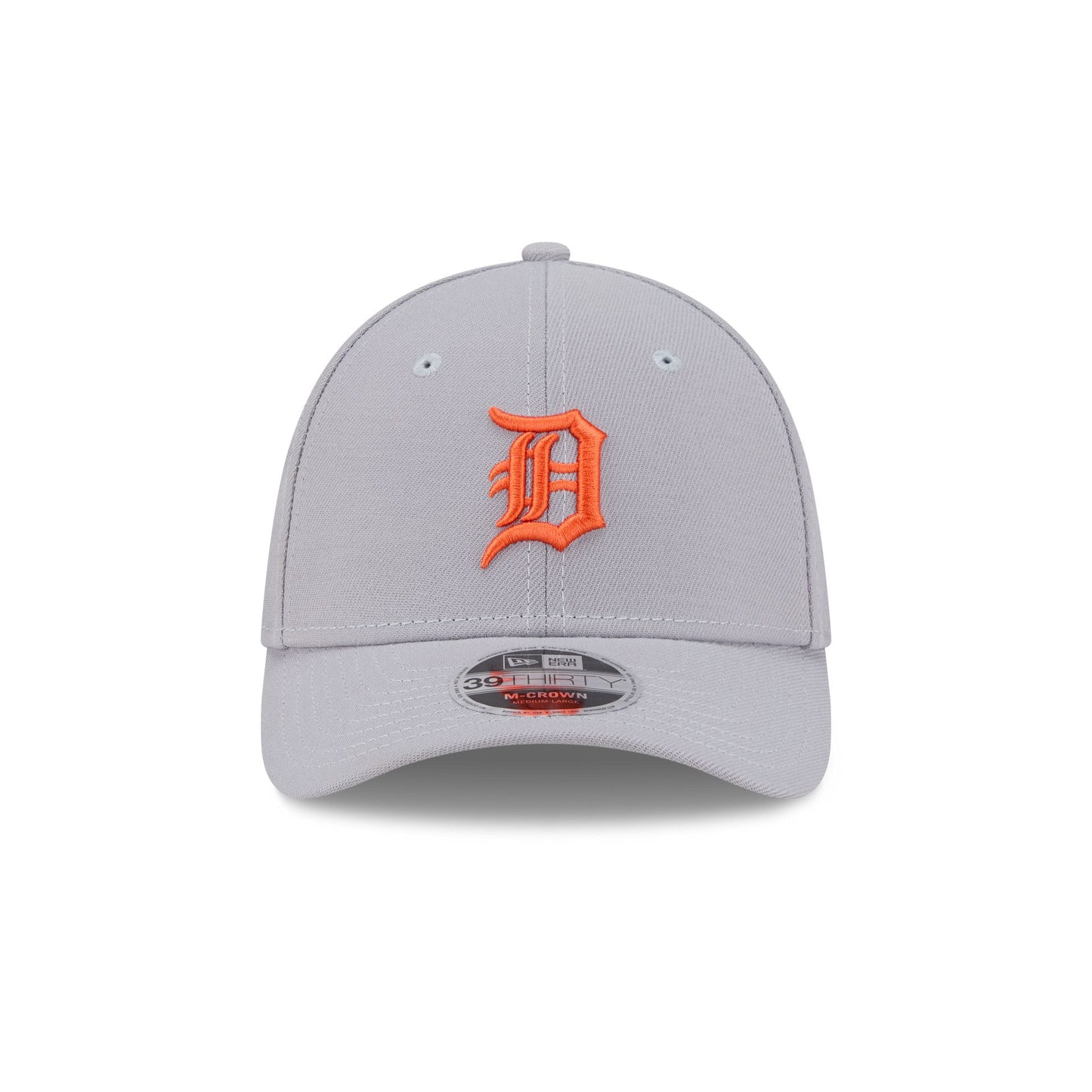 The Detroit Tigers Gray 39THIRTY M-Crown Stretch Fit Cap features an embroidered Tigers logo at the front panels with a matching team wordmark at the rear and a gray undervisor. Additional details include a Performance Stretch sweatband and a New Era Flag at the left-wear side.