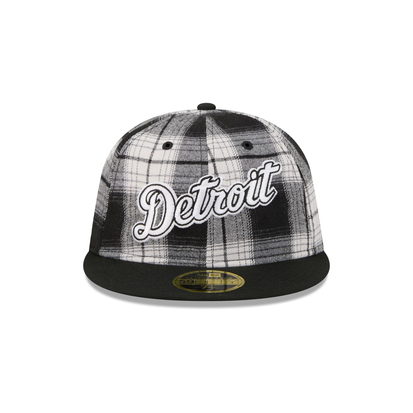 The Detroit Tigers Grunge Plaid Retro Crown 59FIFTY Fitted Cap features an embroidered Tigers Cooperstown wordmark at the front panels with a matching MLB Batterman logo at the rear, a team logo at the right-wear side, and a black undervisor.