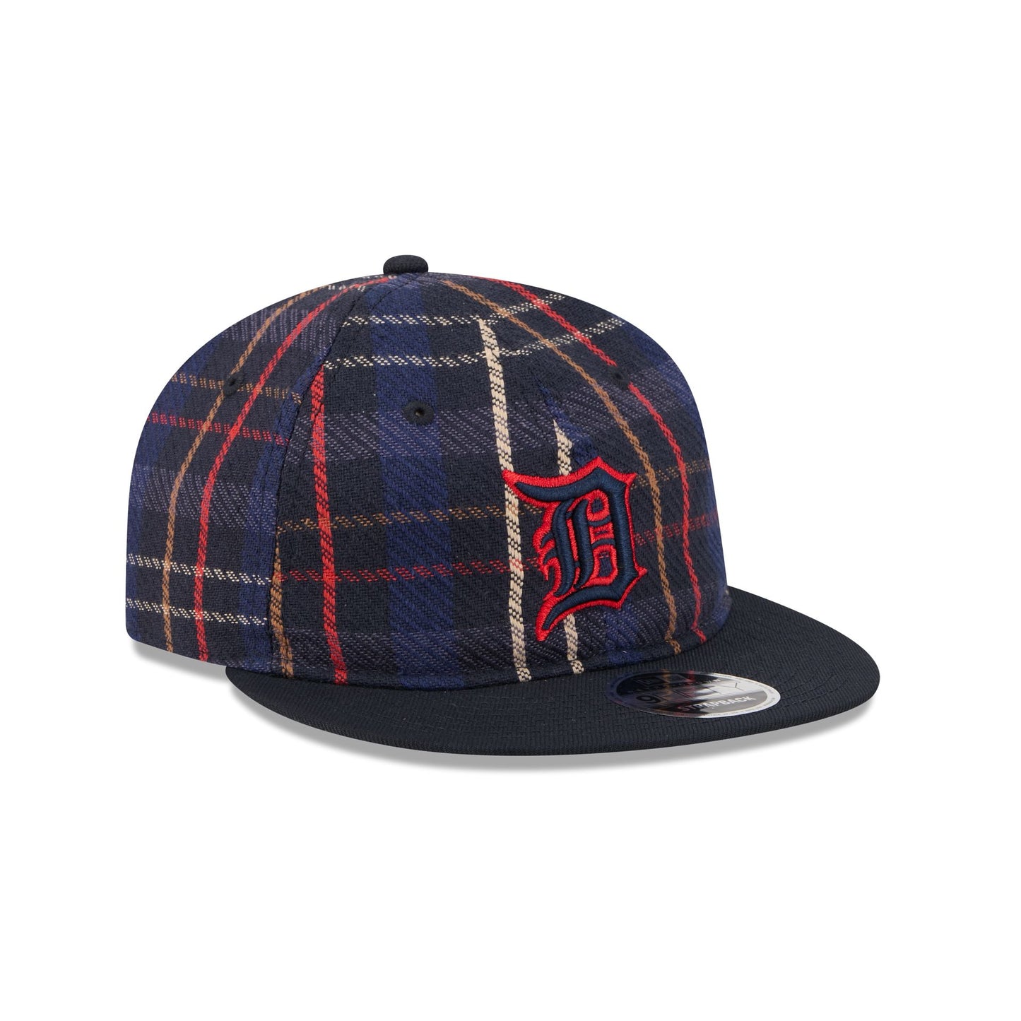 The Detroit Tigers Grunge Plaid Retro Crown 9FIFTY Adjustable Cap features an embroidered Tigers logo at the front panels with an adjustable leather strap closure at the rear and a navy undervisor.
