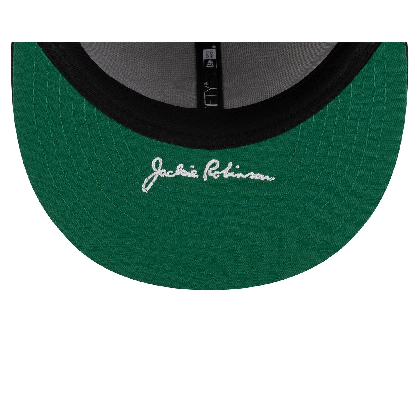 The Detroit Tigers Jackie Robinson Day 2025 Retro Crown 9FIFTY Snapback features an embroidered Tigers logo at the front panels with an MLB Batterman logo above a snapback closure at the rear. Additional details include a Jackie Robinson pin at the left panel and Robinson's embroidered signature on a green undervisor.