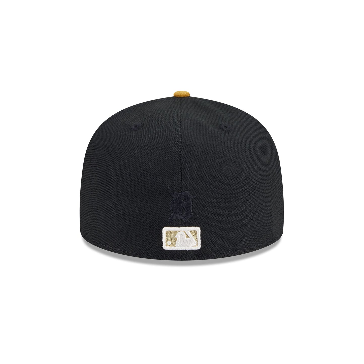 The Detroit Tigers Metallic Gold Logo 59FIFTY Fitted Cap features an embroidered gold Tigers logo at the front panels with a matching MLB Batterman logo at the rear. Additional details include a gold visor and a gray undervisor.
