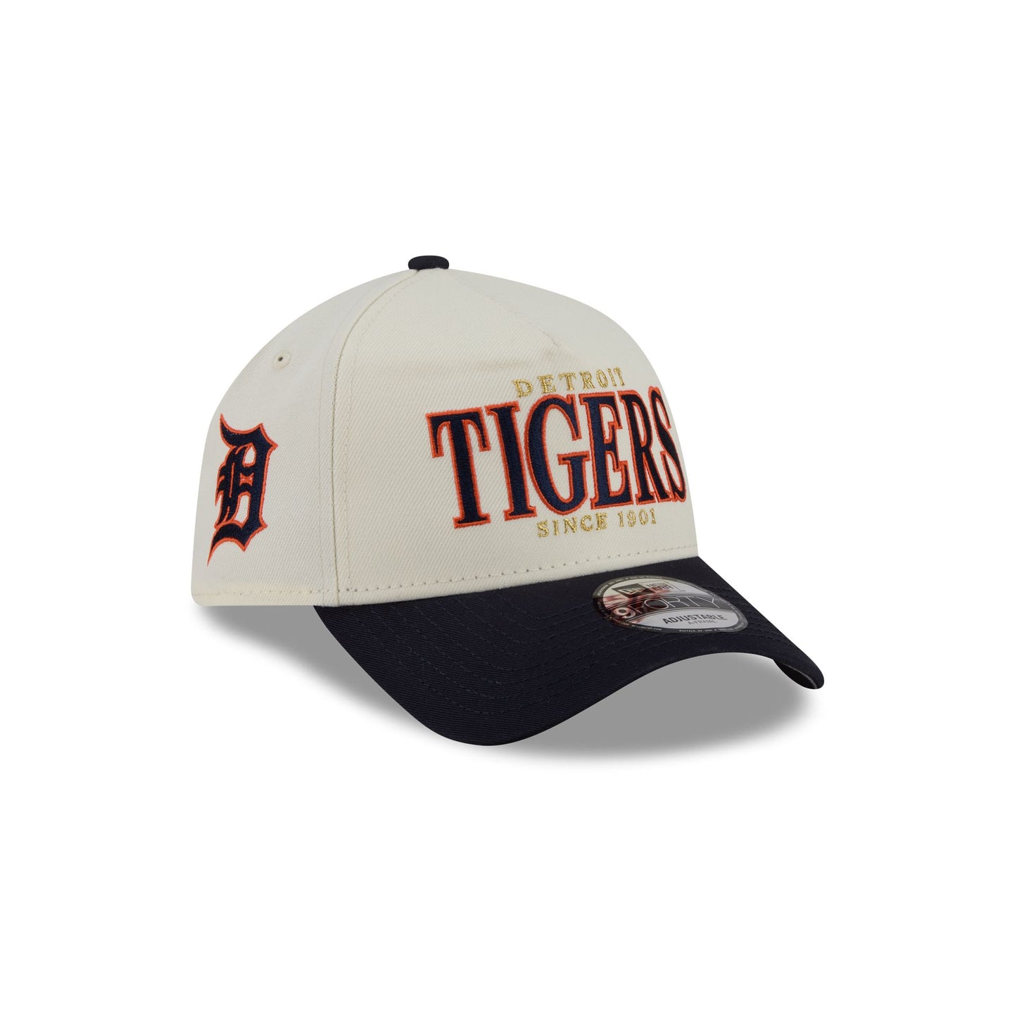 The Detroit Tigers Opening Day Chrome White 9FORTY A-Frame Snapback features an embroidered Tigers wordmark at the front panels with a team logo at the right-wear side. Additional details include an adjustable snapback closure at the rear and a gray undervisor.