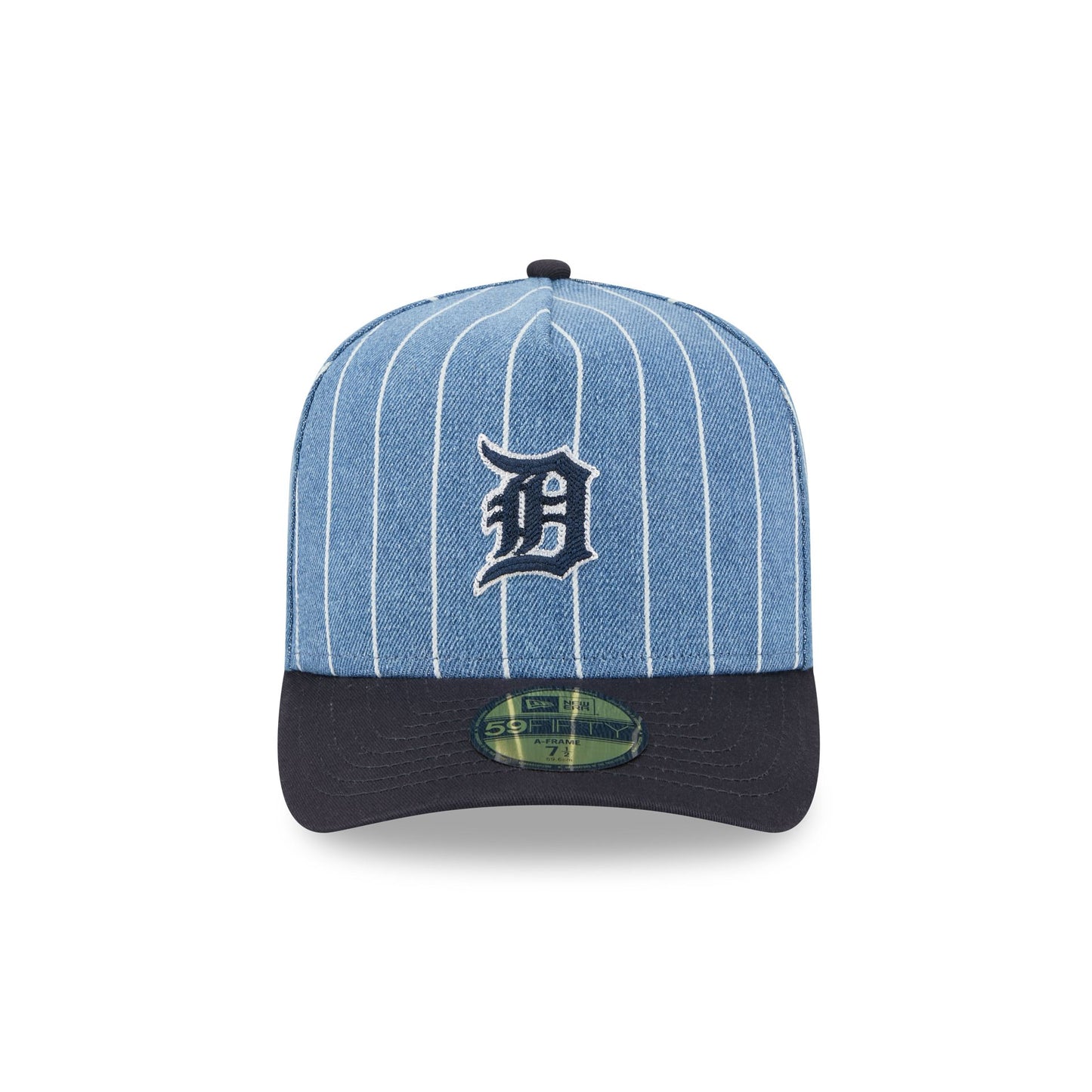 The Detroit Tigers Parallel 59FIFTY A-Frame Fitted Cap features an embroidered Tigers parallel stitch logo at the front panels against a denim pinstripe fabrication throughout. Additional details include a matching MLB Batterman logo at the rear and a gray undervisor.