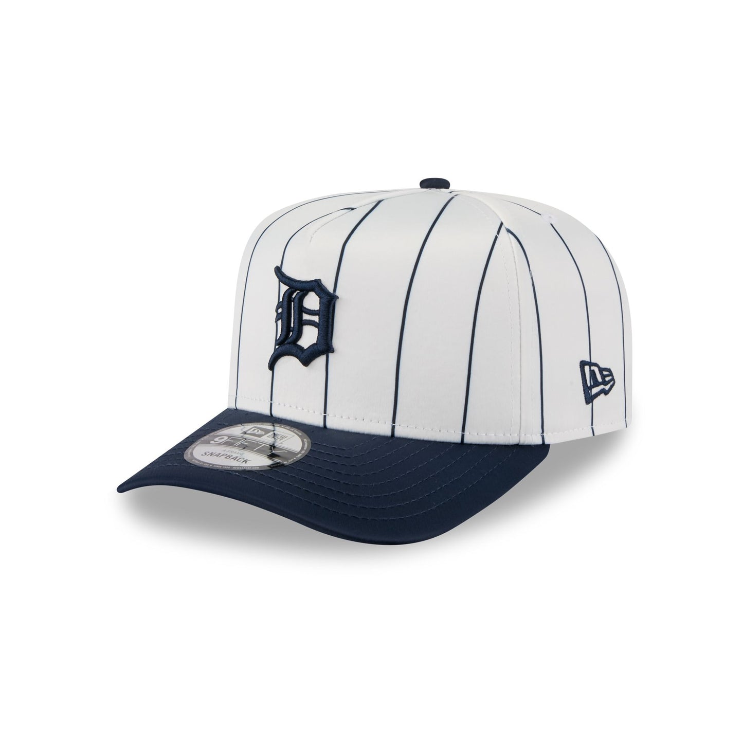 The Detroit Tigers Satin Pinstripe 9FIFTY A-Frame Snapback features an embroidered Tigers logo at the front panel with a team color visor, a gray undervisor, and a snapback closure at the rear.