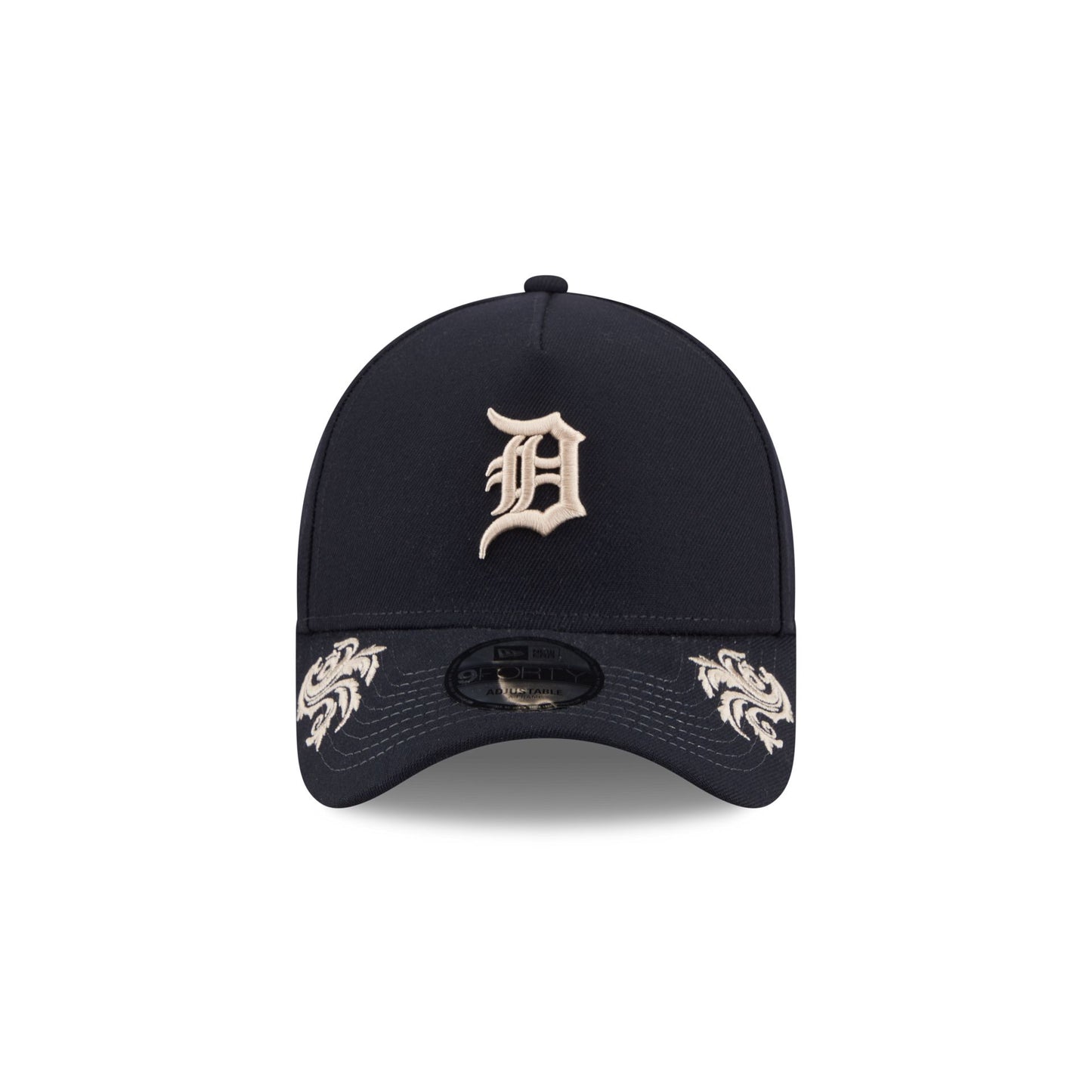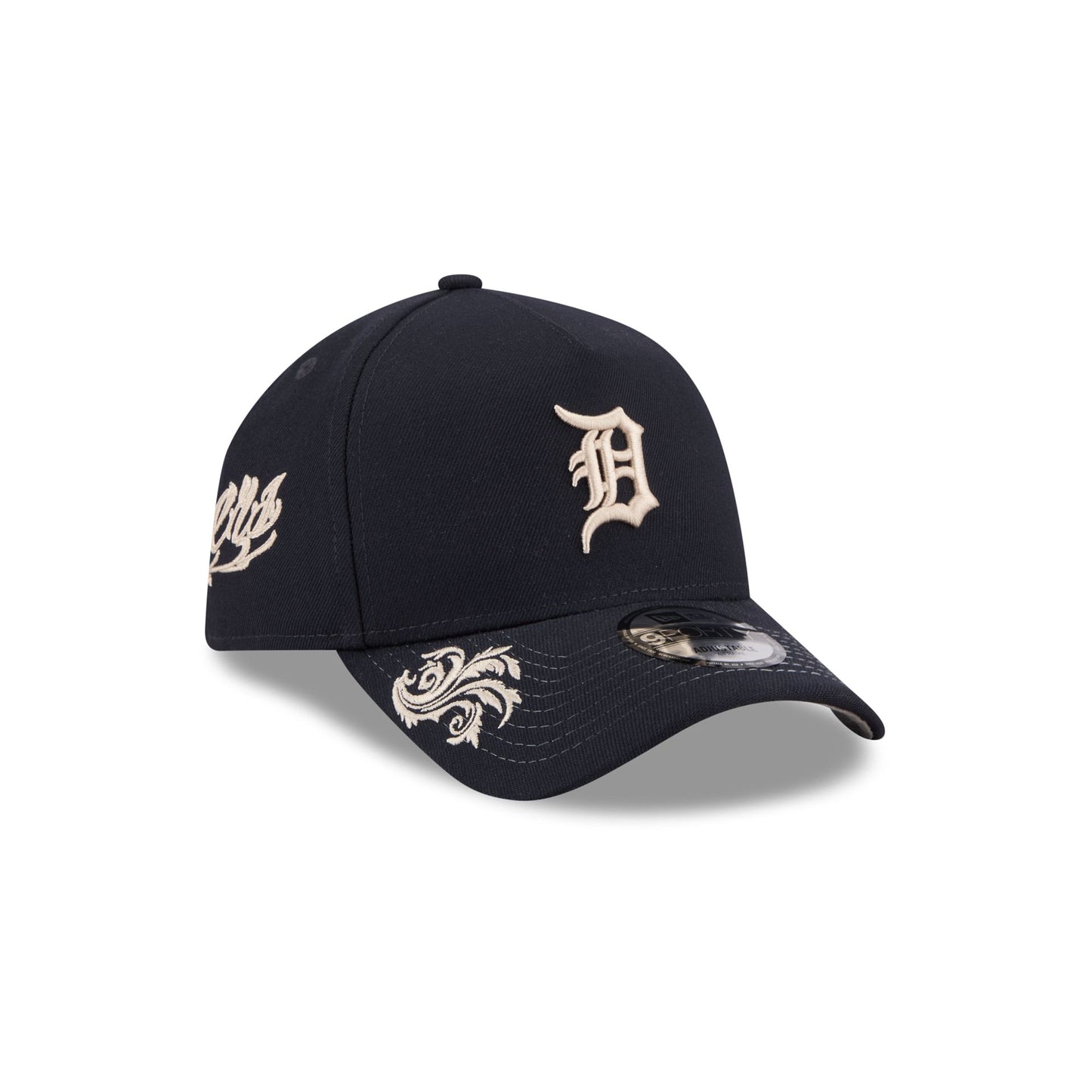 The Detroit Tigers Script 9FORTY A-Frame Snapback features an embroidered Tigers logo at the front panel with an adjustable snapback closure at the rear. Additional details include a team script at the right-wear side with ornamental details throughout the cap and a gray undervisor.