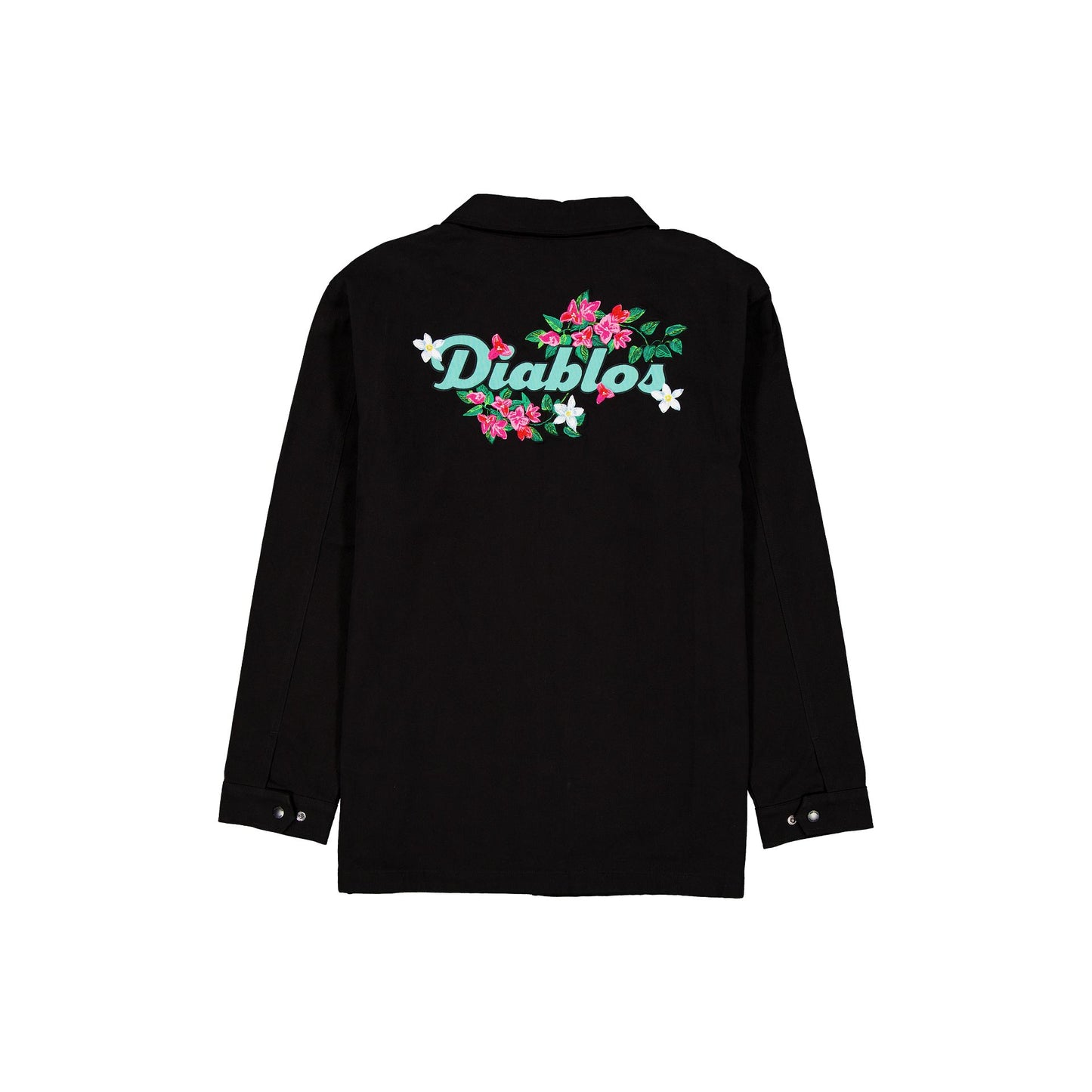 The Diablos Rojos del México Black Floral Jacket features an embroidered Diablos Rojos applique floral logo at the left chest with a matching wordmark at the rear. Additional details include a front button closure, pockets, and adjustable drawstrings at the waist.