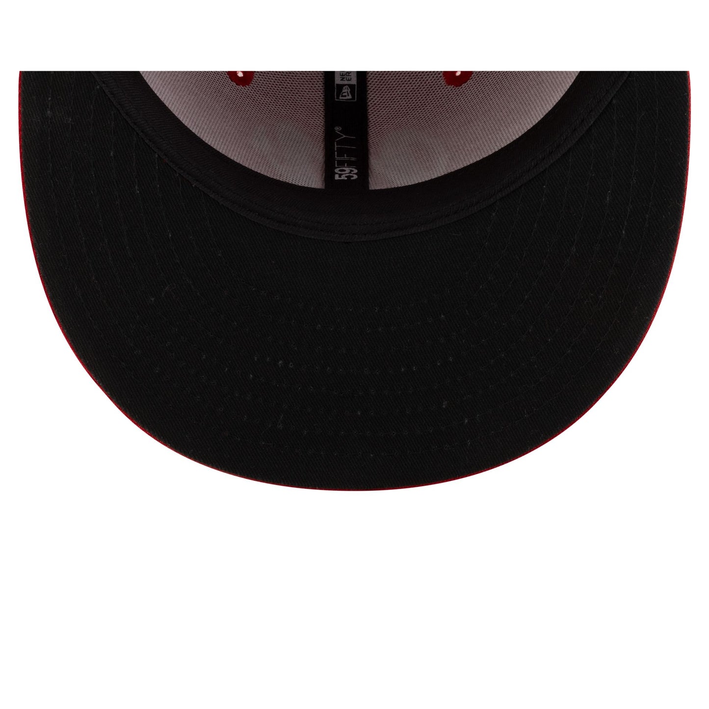 The Diablos Rojos del México LMB 100th Anniversary Home 59FIFTY Fitted Cap features an embroidered Diablos Rojos logo at the front panels with a LMB 100th Anniversary patch at the rear and black undervisor.