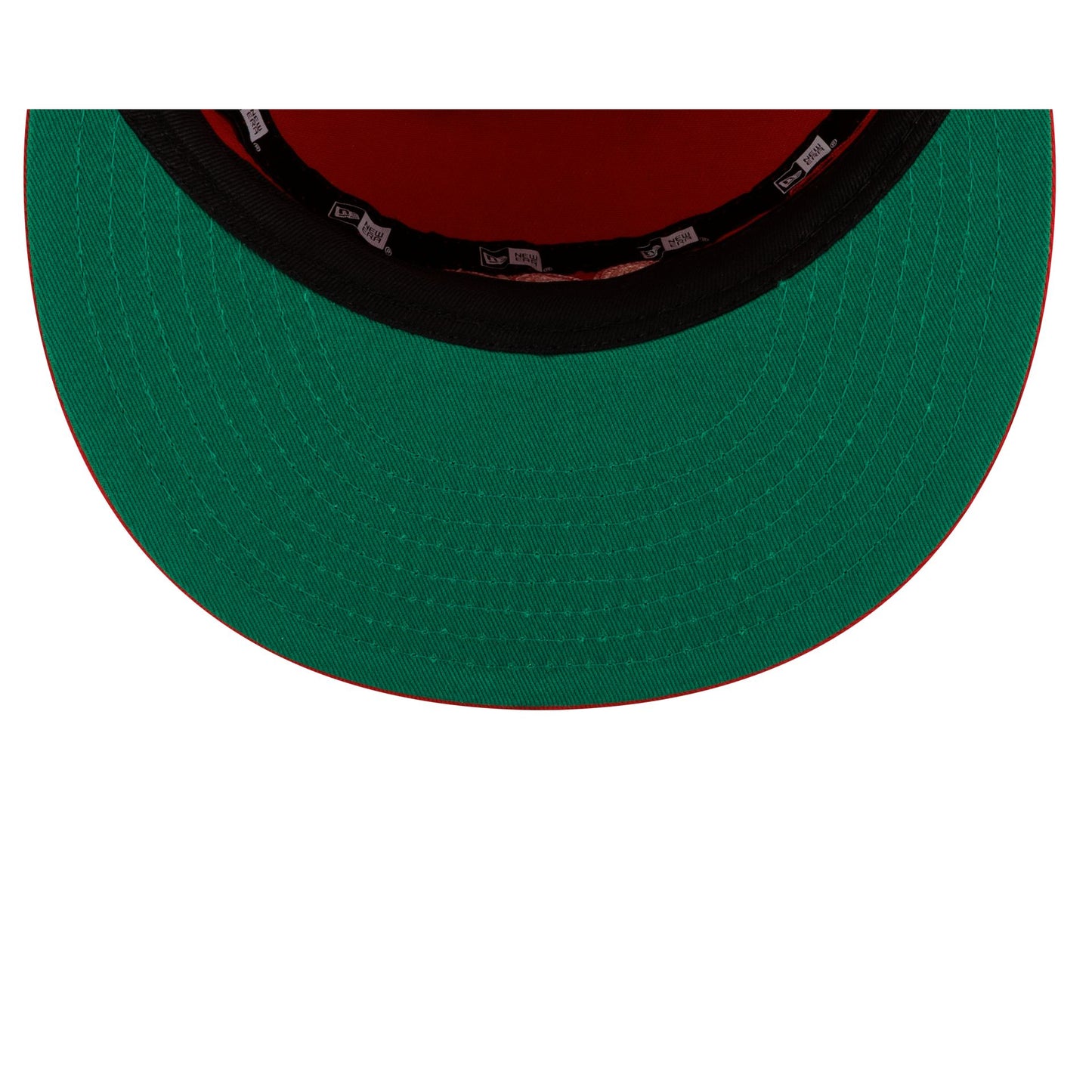 The Diablos Rojos del México Retro Pillbox Hat features an embroidered Diablos Rojos retro logo at the front panels with a 100th Anniversary LMB logo at the rear and a green undervisor.