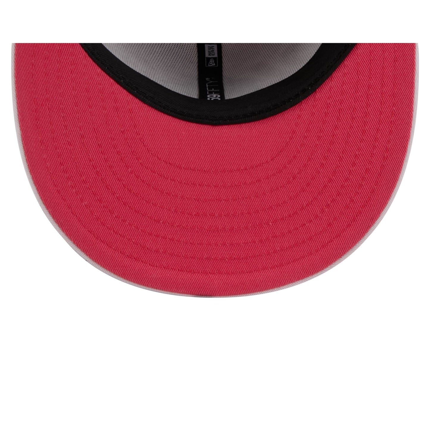 The Diablos Rojos del México Stacked Wordmark 59FIFTY Fitted Cap features a chainstitched Diablos Rojos wordmark with a pink embroidered layered logo on top at the front panels and a matching team wordmark at the rear. Additional details include a team patch at the right-wear side with a pink visor and a coral undervisor.