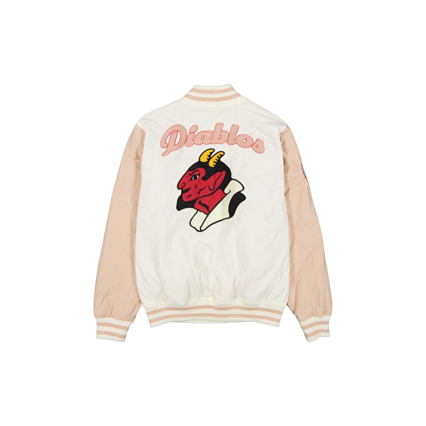 The Diablos Rojos del México Stone Floral Jacket features an embroidered Diablos Rojos applique floral logo at the left chest with a matching logo and wordmark at the rear. Additional details include a front button closure and pockets.