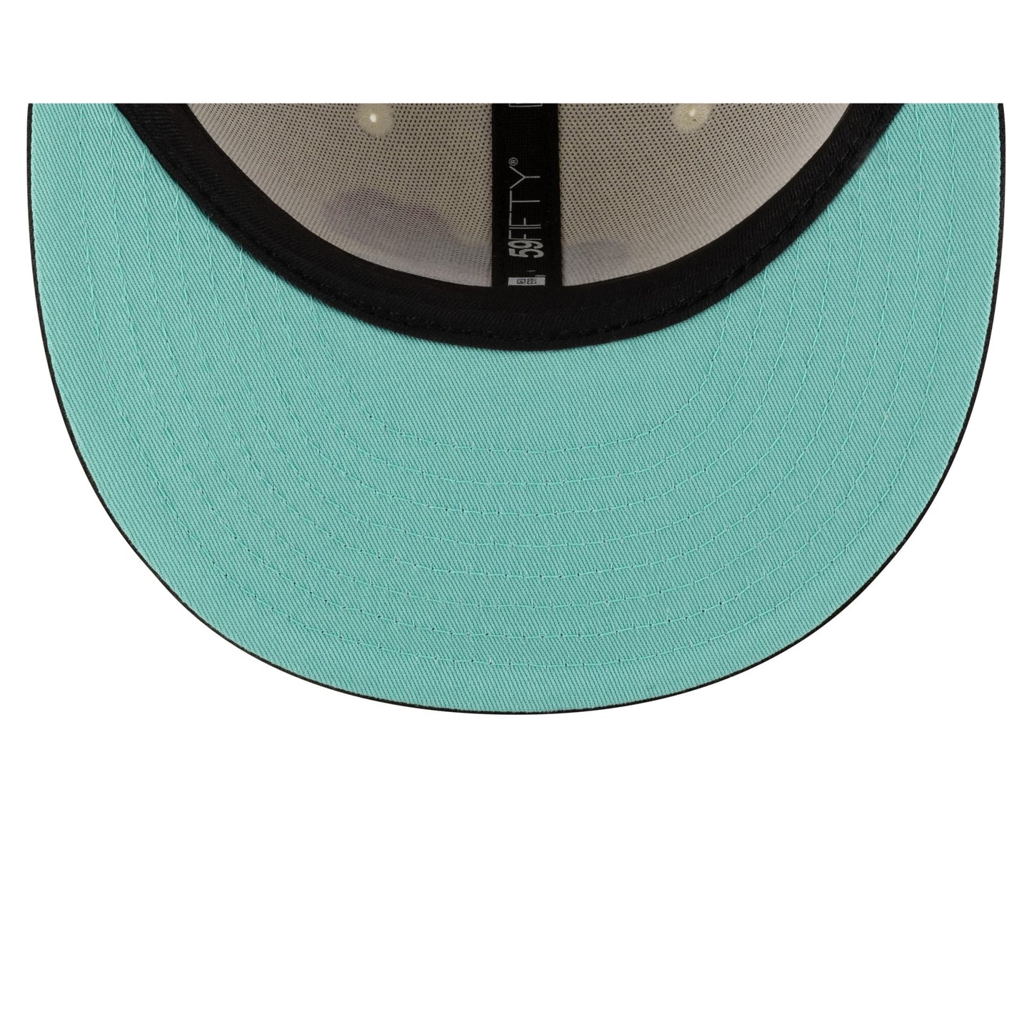 The Diablos Rojos del México Two-Tone Rose 59FIFTY Fitted Cap features an embroidered Diablos Rojos logo and roses at the front panels with a matching team wordmark at the right-wear side. Additional details include an alternate team wordmark at the rear with a black visor and a mint undervisor.