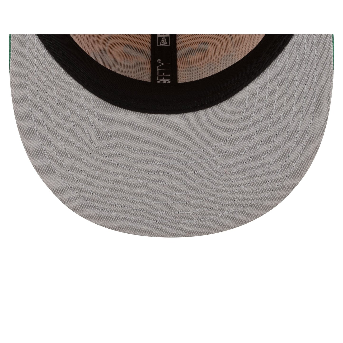 The Diet Starts Monday x Athletics Pinstripe 59FIFTY Fitted Cap features an embroidered Athletics Cooperstown logo at the front panels with a "Is this Love or Madness?" wordmark at the left-wear side. Additional details include a 25th Anniversary patch at the right-wear side, a Diet Starts Monday logo above an MLB Batterman logo at the rear, and a gray undervisor.