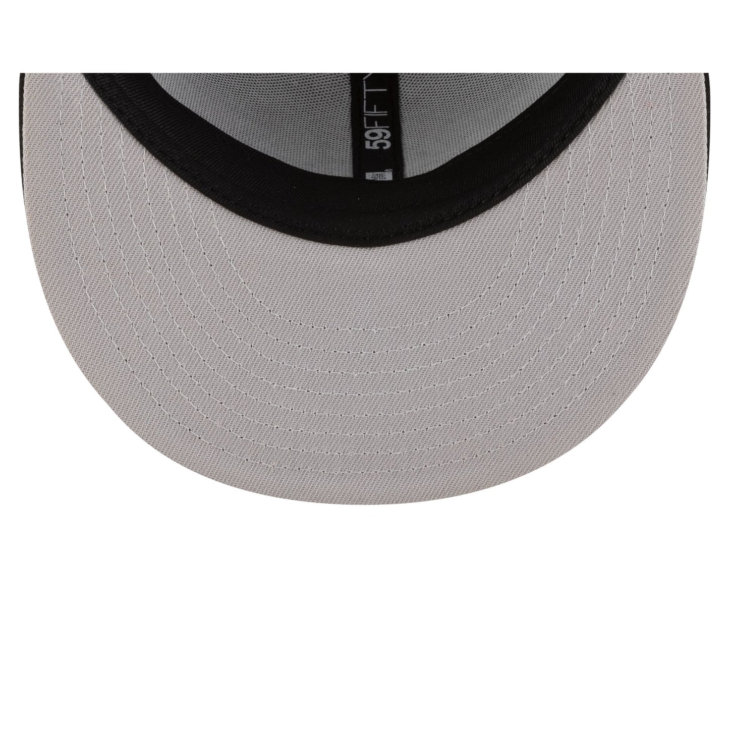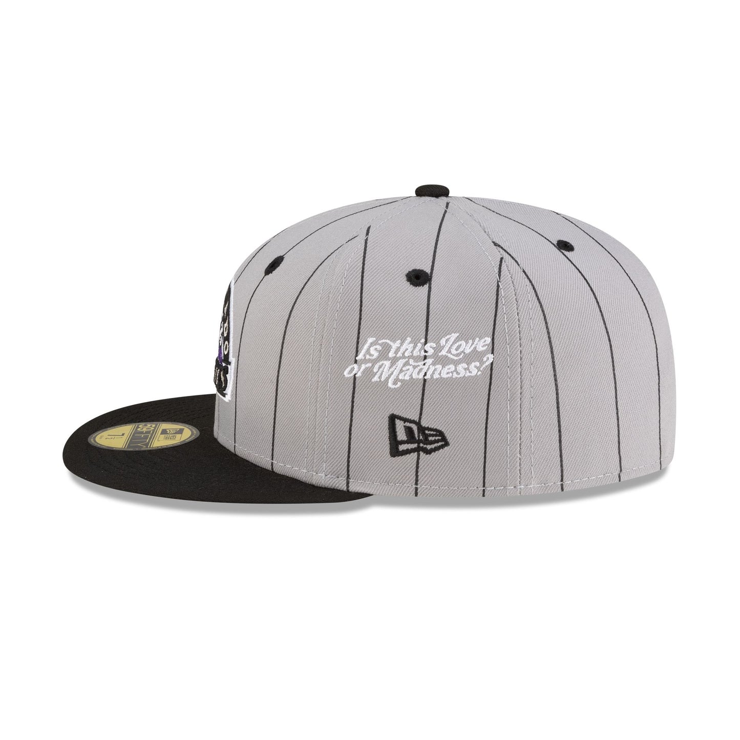 The Diet Starts Monday x Colorado Rockies Pinstripe 59FIFTY Fitted Cap features an embroidered Rockies logo at the front panels with a "Is this Love or Madness?" wordmark at the left-wear side. Additional details include a 1998 All-Star Game patch at the right-wear side, a Diet Starts Monday logo above an MLB Batterman logo at the rear, and a gray undervisor.