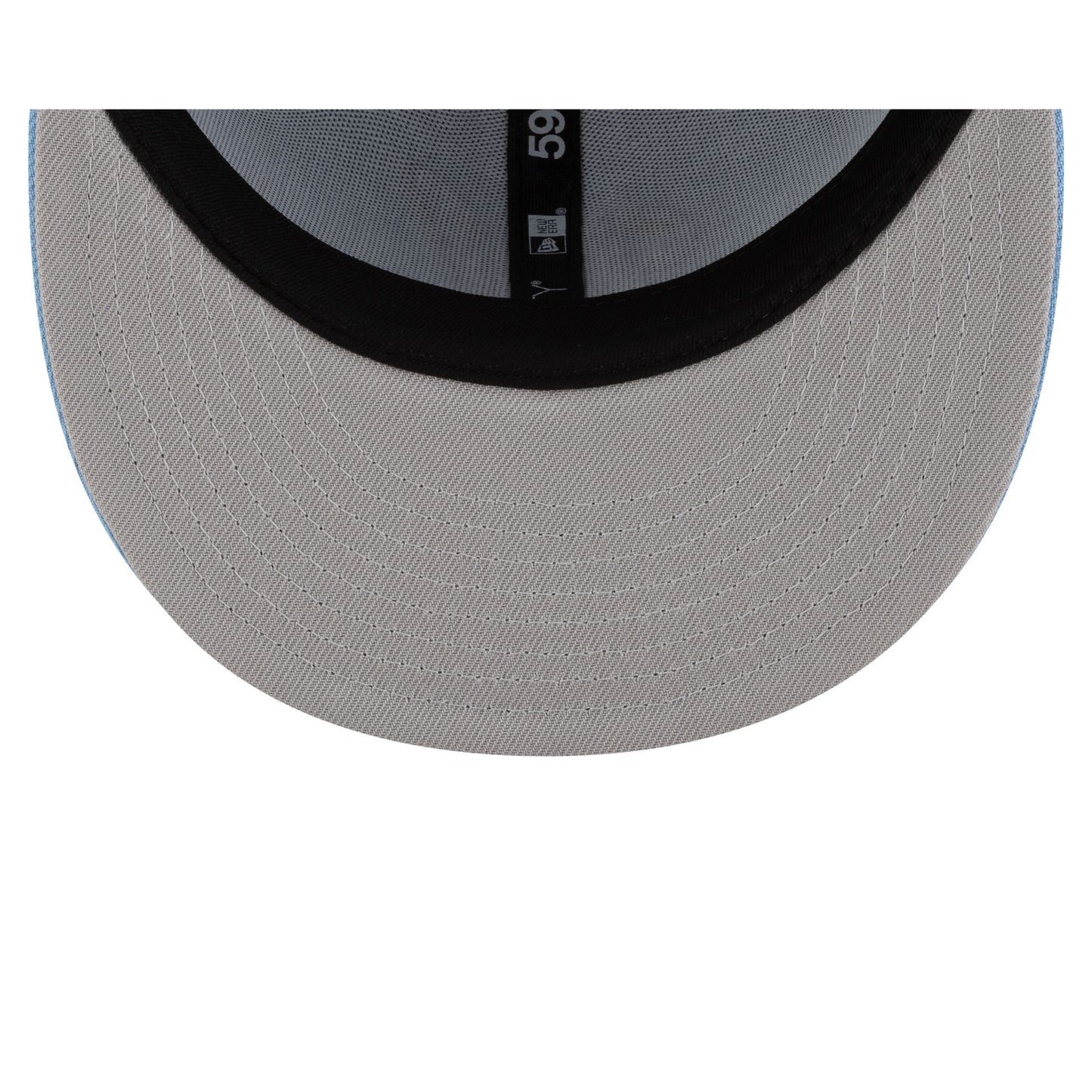 The Diet Starts Monday x Milwaukee Brewers Lightening Bolts 59FIFTY Fitted Cap features an embroidered Brewers Cooperstown wordmark and lightening bolts at the front panels with a "Is this Love or Madness?" wordmark at the left-wear side. Additional details include a 2002 All-Star Game patch at the right-wear side, a Diet Starts Monday logo above an MLB Batterman logo at the rear, and a gray undervisor.