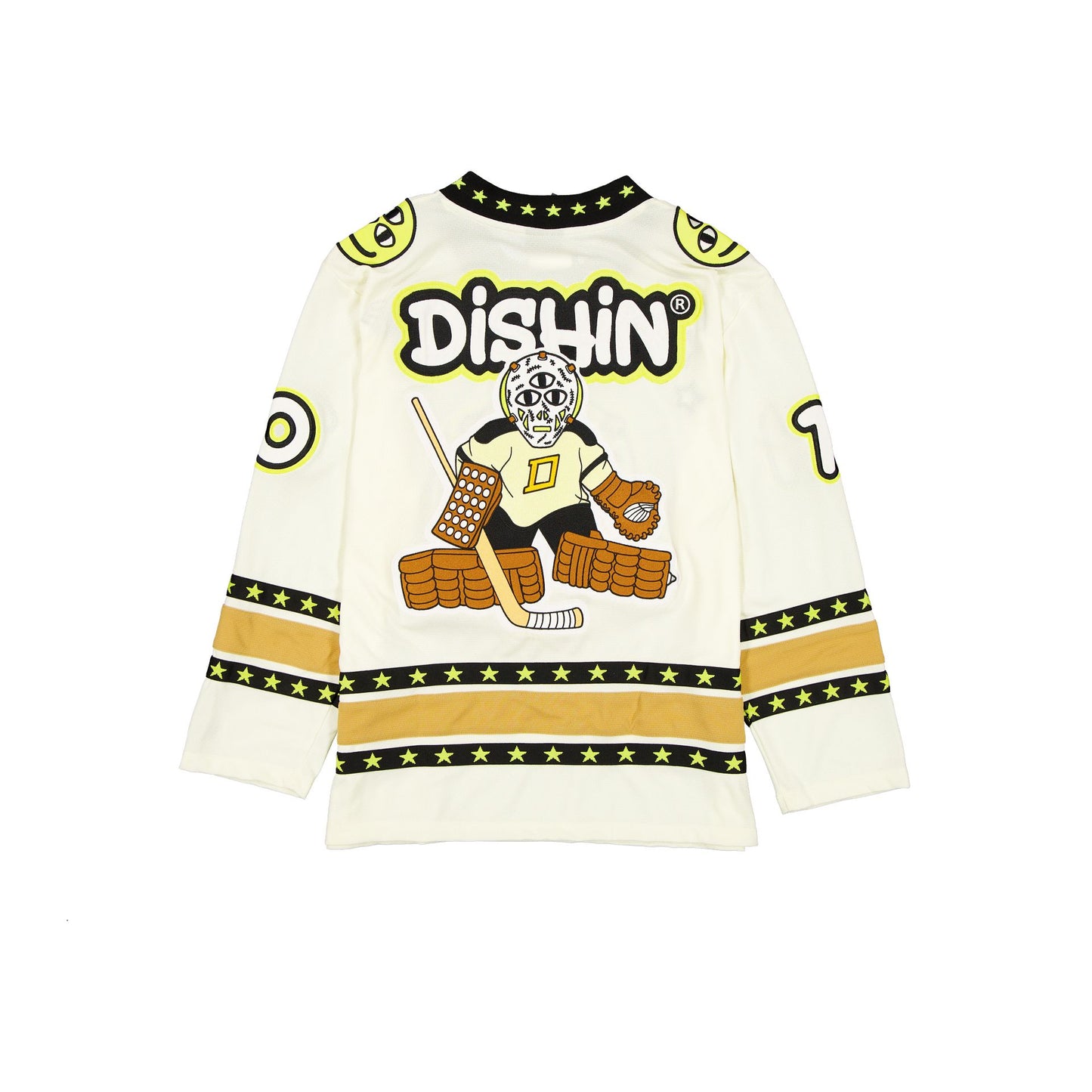 The DISHIN® Hockey Jersey a twill applique hockey mask and New Era Flag at the front with a DISHIN® goalie patch at the rear. Additional details include DISHIN® logos throughout the jersey with 19-20 patches at the sleeves, a woven brand tag at the hem, and star patterned taping throughout the jersey.