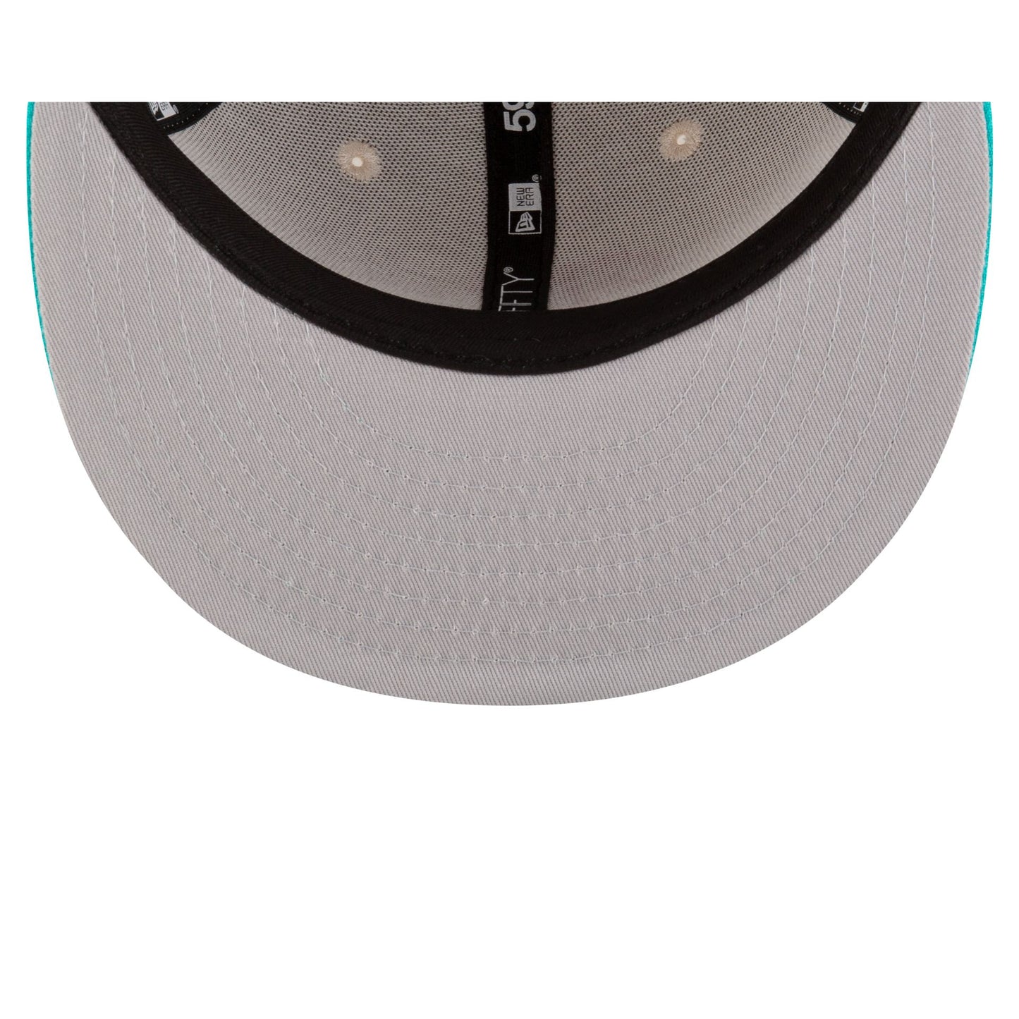 The Dominican Republic Chrome Teal 59FIFTY Fitted Cap features an embroidered Dominican Republic logo at the front panels with a matching FEDOM logo at the rear and a gray undervisor.
