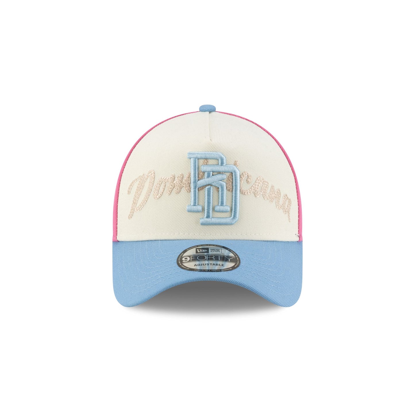 The Dominican Republic Pink 9FORTY A-Frame Snapback features an embroidered DR logo over a chainstitched team wordmark at the front panel with a color block crown. Additional details include a team wordmark above a snapback closure at the rear with a blue visor and a gray undervisor.