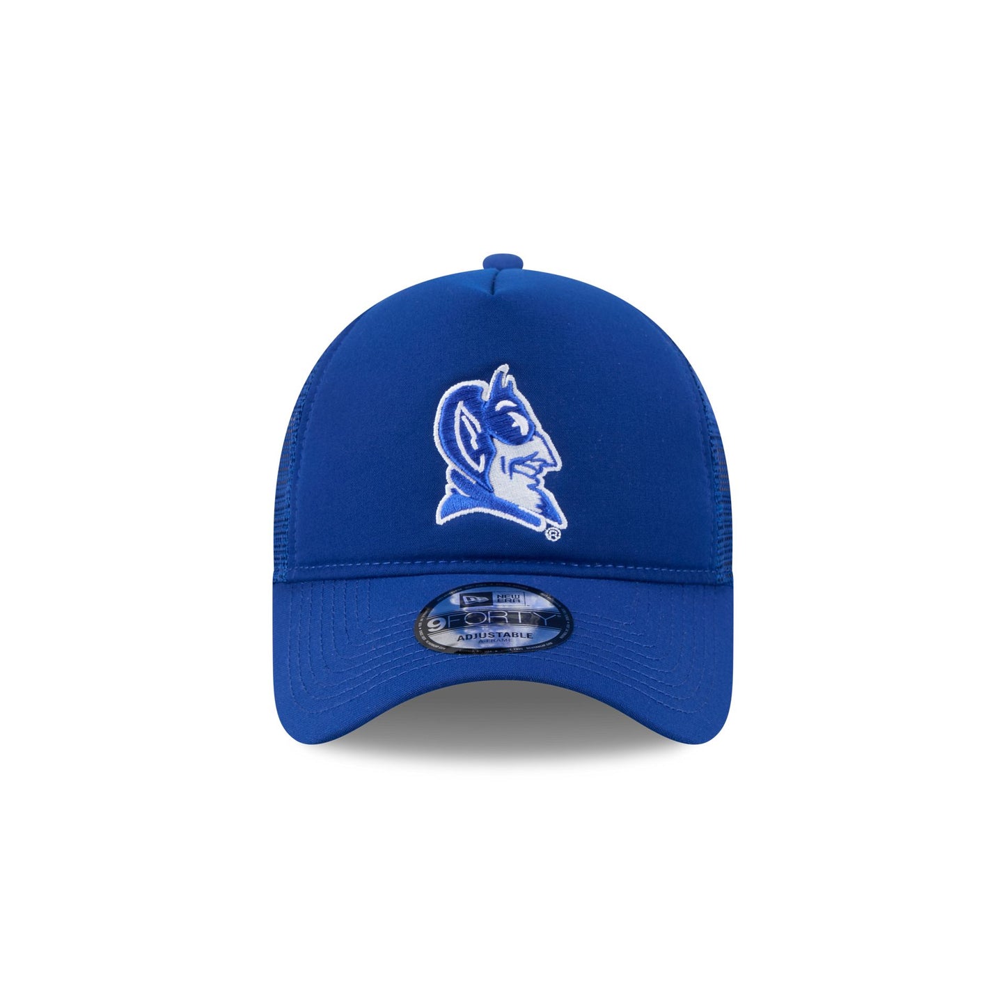 The Duke Blue Devils Go-To 9FORTY A-Frame Trucker features an embroidered Blue Devils logo at the front panels with a snapback closure at a mesh rear.