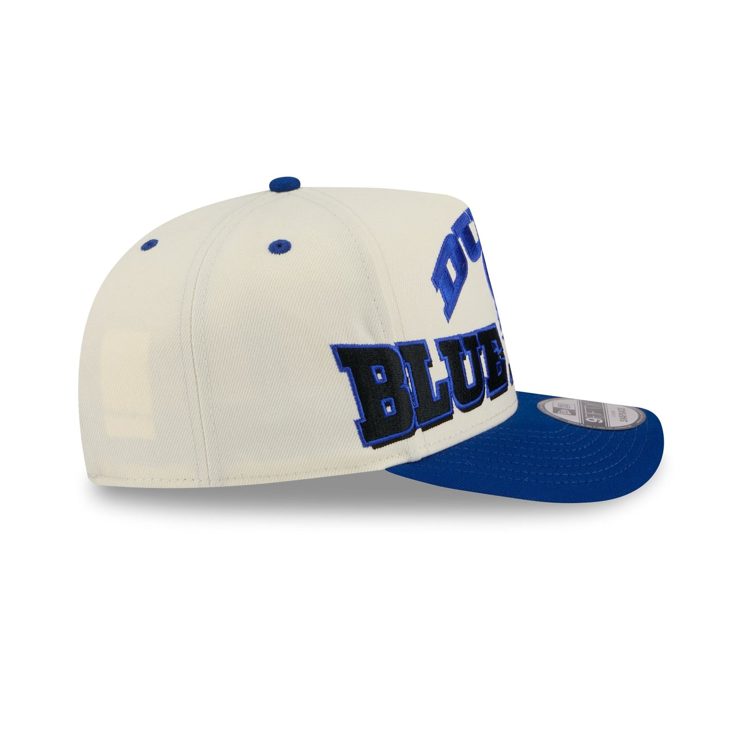 The Duke Blue Devils March Madness Chrome 9FIFTY A-Frame Snapback features an embroidered Blue Devils logo and wordmark across the front panel with an adjustable snapback closure at the rear, a blue visor, and a green undervisor.