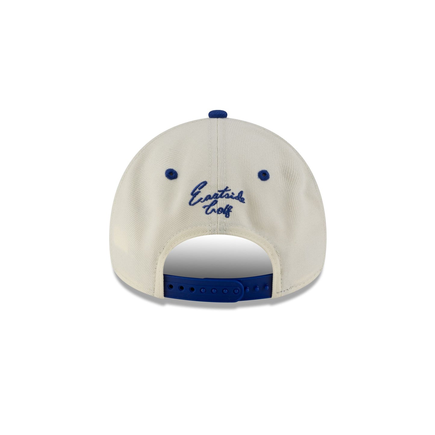 The Eastside Golf x Golden State Warriors 9FORTY A-Frame Snapback features an embroidered basketball and net at the front panels with a team logo at the right-wear side. Additional details include an Eastside Gold script embroidery above an adjustable snapback closure at the rear and a gray undervisor.