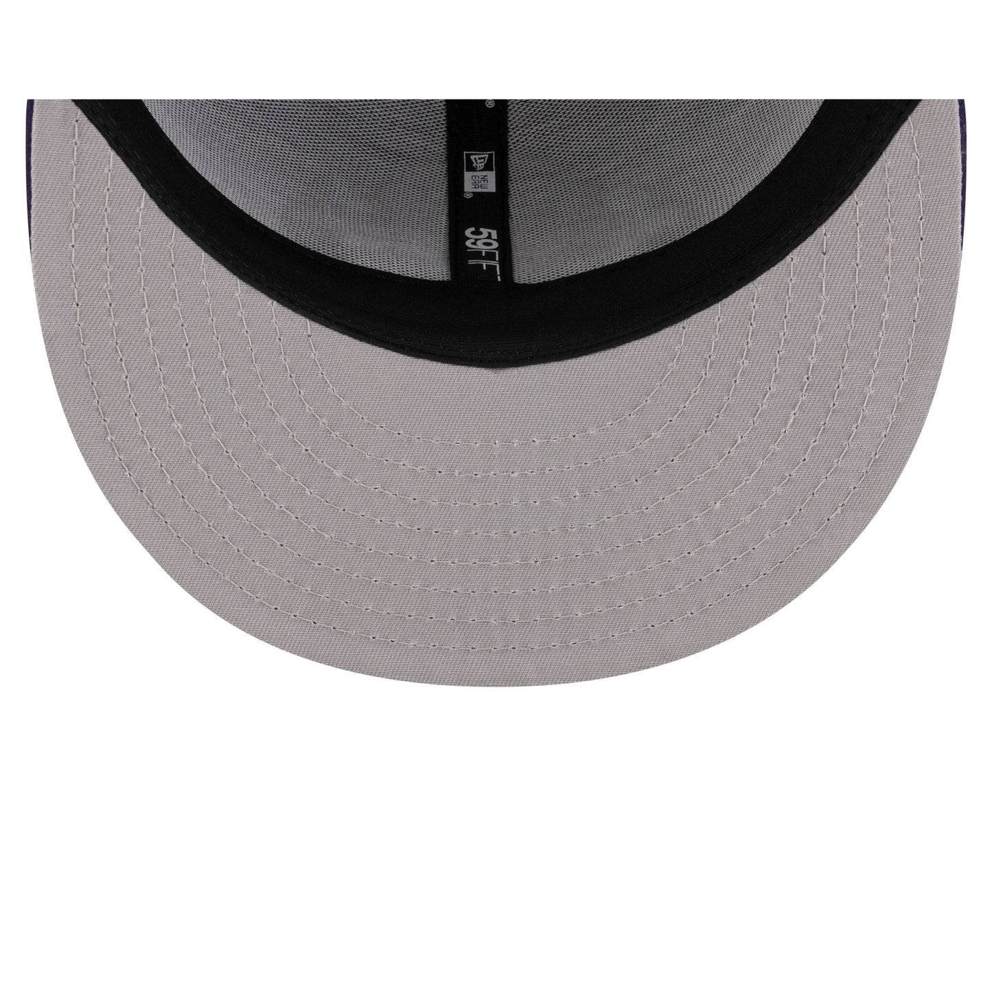 The Erie Moon Mammoths 59FIFTY Fitted Cap features an embroidered Moon Mammoths logo at the front panels with a matching MiLB Batterman logo at the rear, a purple visor, and a gray undervisor.