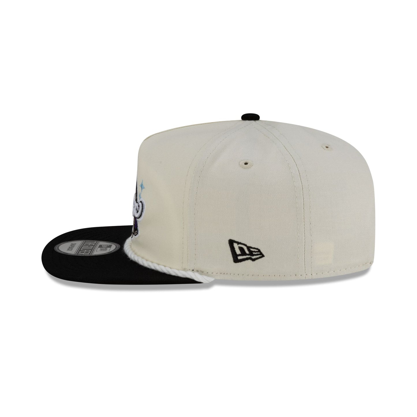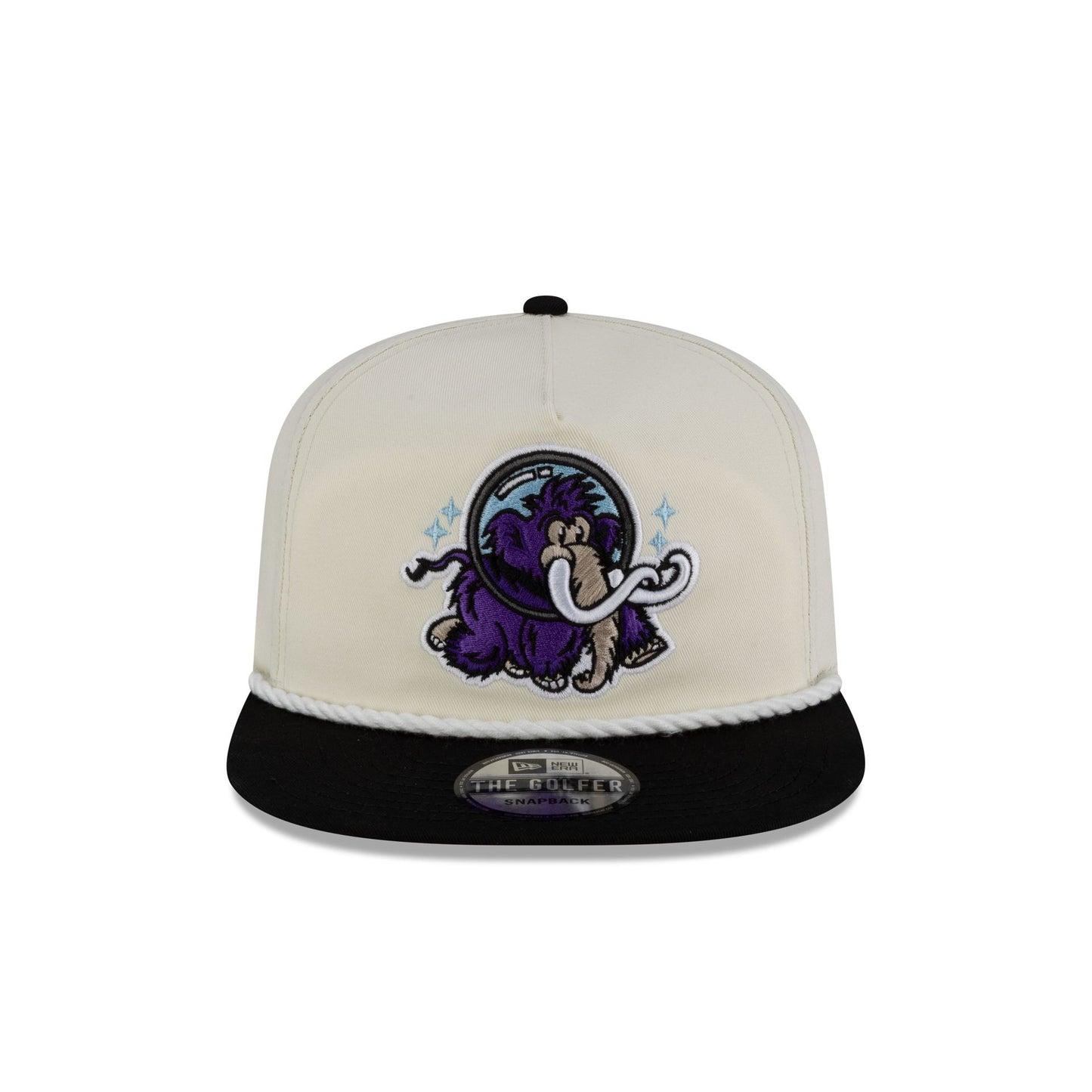 The Erie Moon Mammoths Chrome White Golfer Adjustable Cap features an embroidered Moon Mammoths logo at the front panels with a rope at the visor and an adjustable snapback closure at the rear.