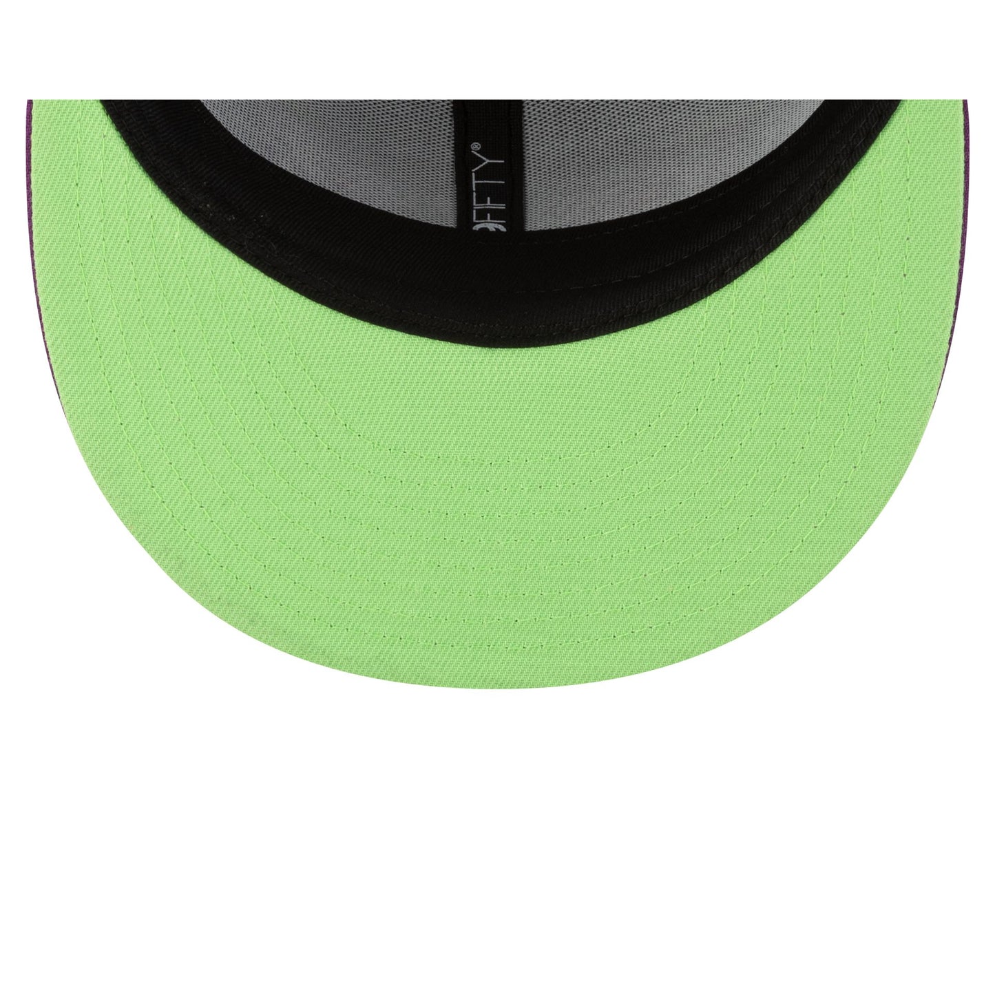 The Erie SeaWolves Halloween Purple 59FIFTY Fitted Cap features an embroidered Erie SeaWolves themed logo at the front panels with a matching MiLB Batterman logo at the rear, a purple visor, and a green undervisor.