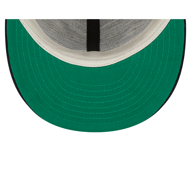 The Fear of God Essentials Corduroy Navy 59FIFTY Fitted Cap features an unstructured crown with an embroidered Fear of God logo at the front panels, a matching MLB Batterman logo at the rear, and a green undervisor.