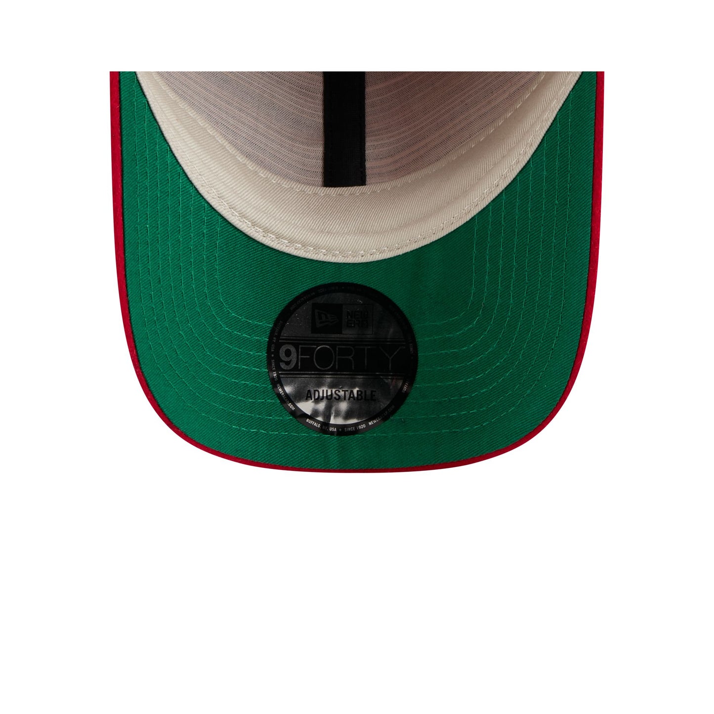 The Fear of God Essentials Kansas City Monarchs Red 9FORTY Adjustable Cap features embroidered felt applique Fear of God patches at the front panels with a New Era script wordmark at the left-wear side. Additional details include a stitched Fear of God tag at an adjustable hook-and-loop closure at the rear and a green undervisor.