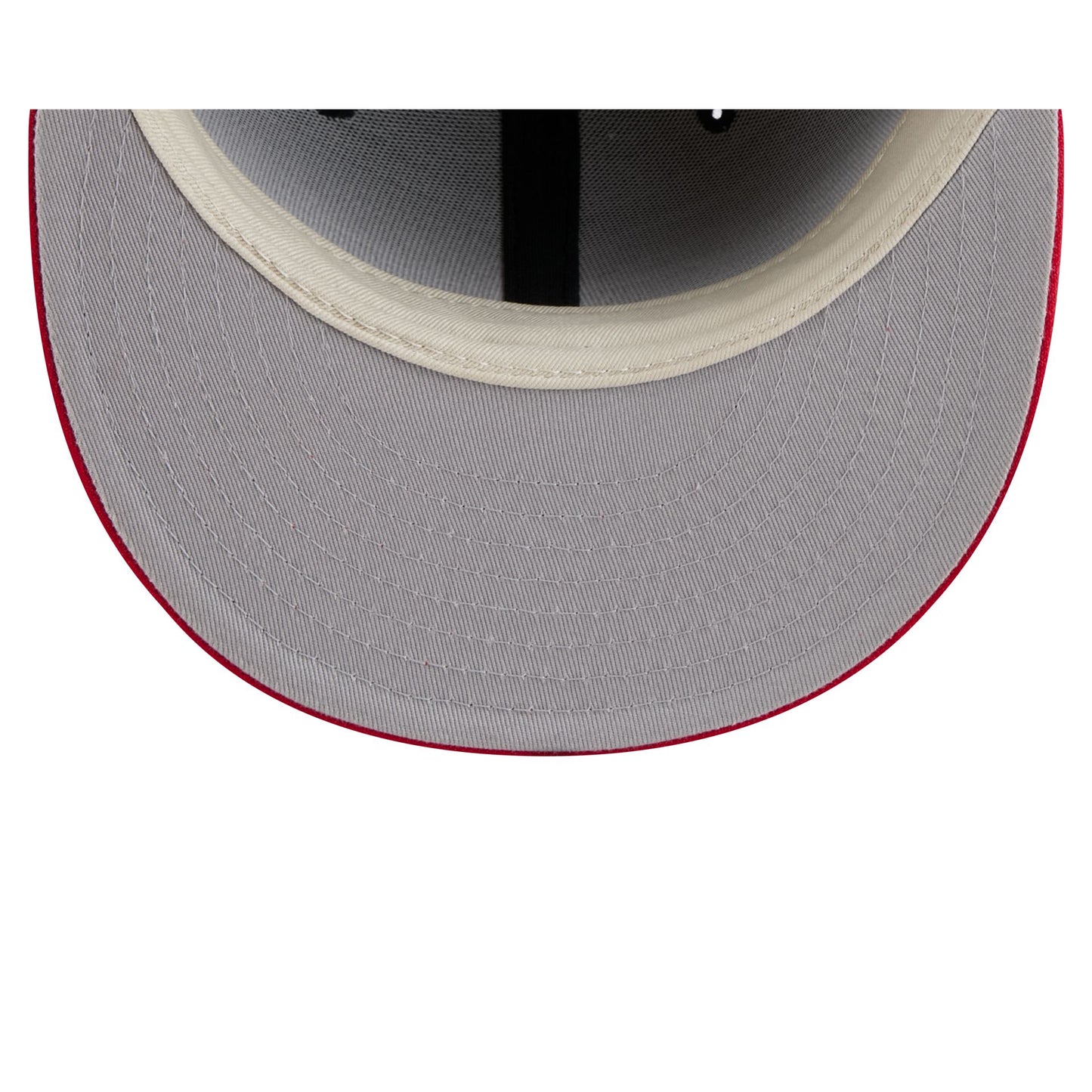 The Fear of God Essentials MLB Navy 59FIFTY Fitted Cap features an embroidered Fear of God logo at the front panels with a New Era script wordmark at the left-wear side. Additional details include an MLB Batterman logo at the rear and a gray undervisor.