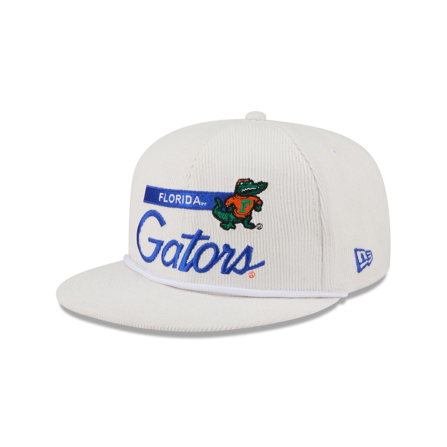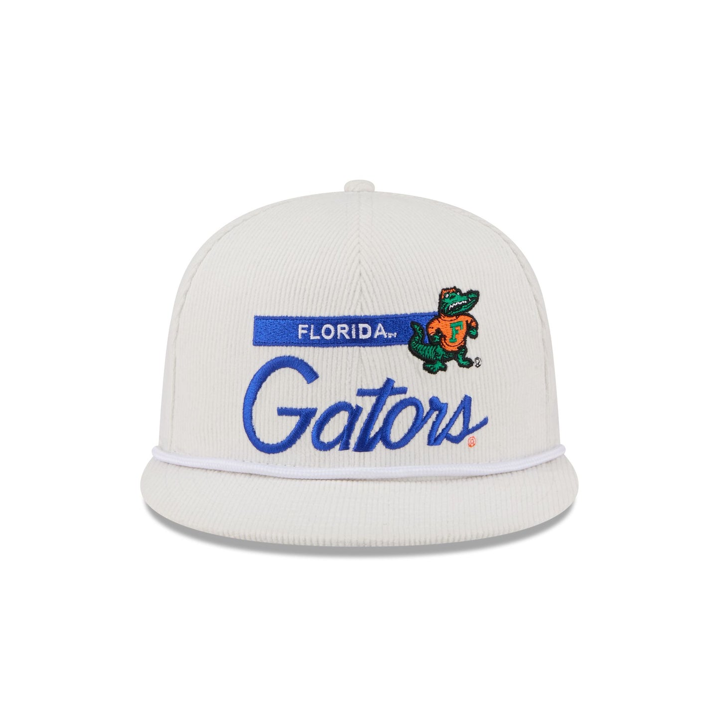 The Florida Gators College Vault Corduroy Rope 9FIFTY Snapback features an embroidered Gators College Vault graphic at the front panels with a corduroy fabrication throughout. Additional details include a rope at the visor, an adjustable snapback closure at the rear, and a gray undervisor.